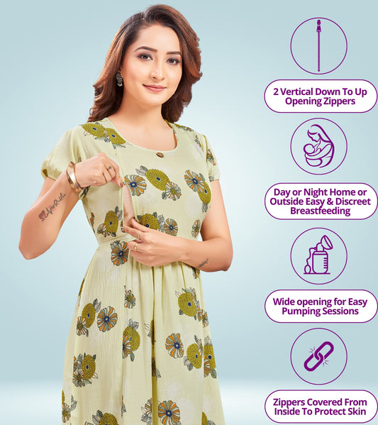 Splendid Green Poly Wrinkle Printed Flared Feeding Dress