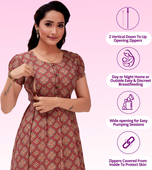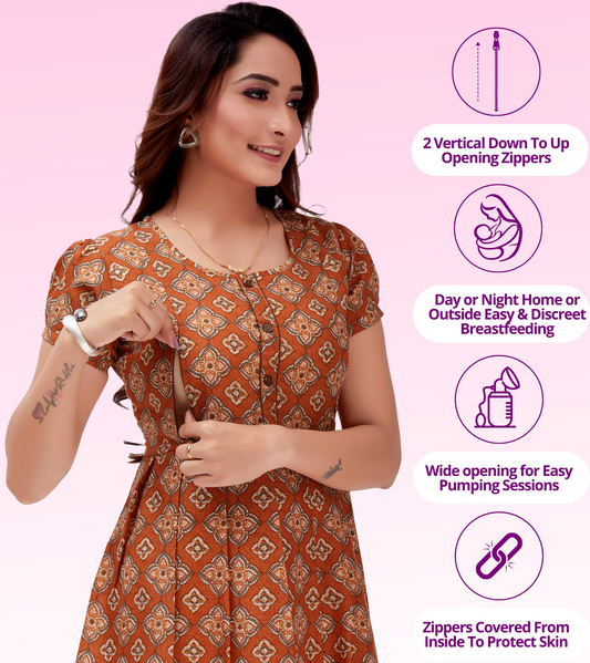 Classy Rust Cotton Blend Printed Flared Feeding Kurta