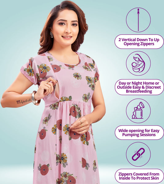 Mesmerizing Pink Poly Wrinkle Printed Flared Feeding Dress