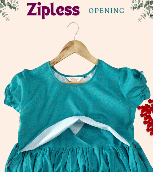 Peacock Green Cotton Printed Flared Zipless Feeding Kurta