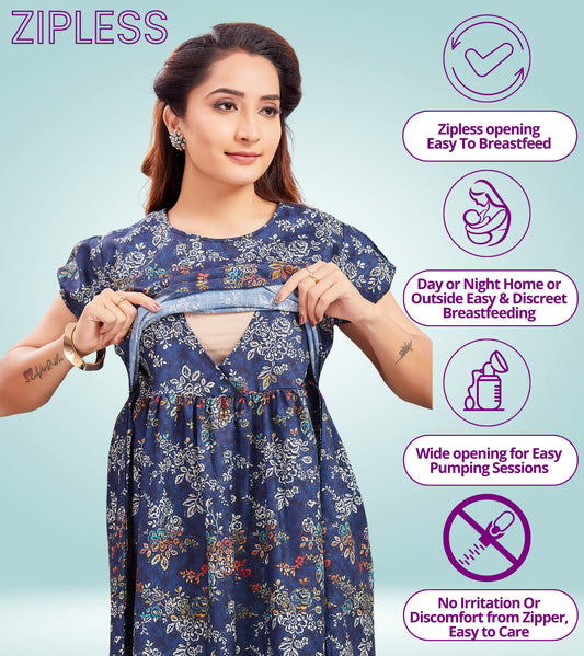 Floral Blue beauty Cotton Printed Flared Zipless Feeding Kurta