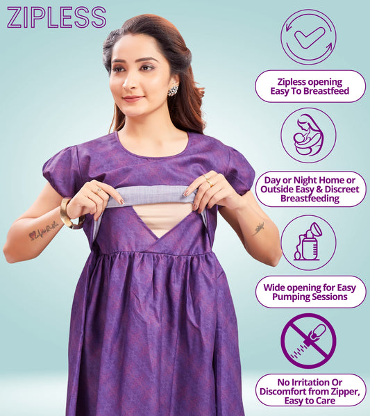 Classy Purple Cotton Printed Flared Zipless Feeding Kurta