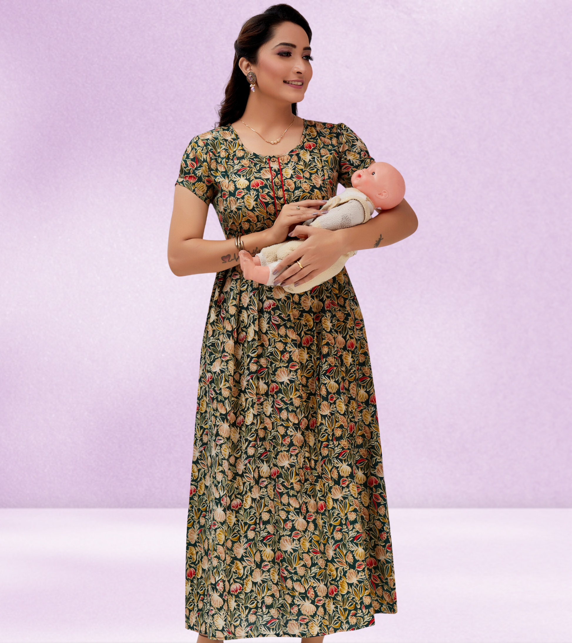Adorable Green Cotton Blend Printed Flared Feeding Kurta