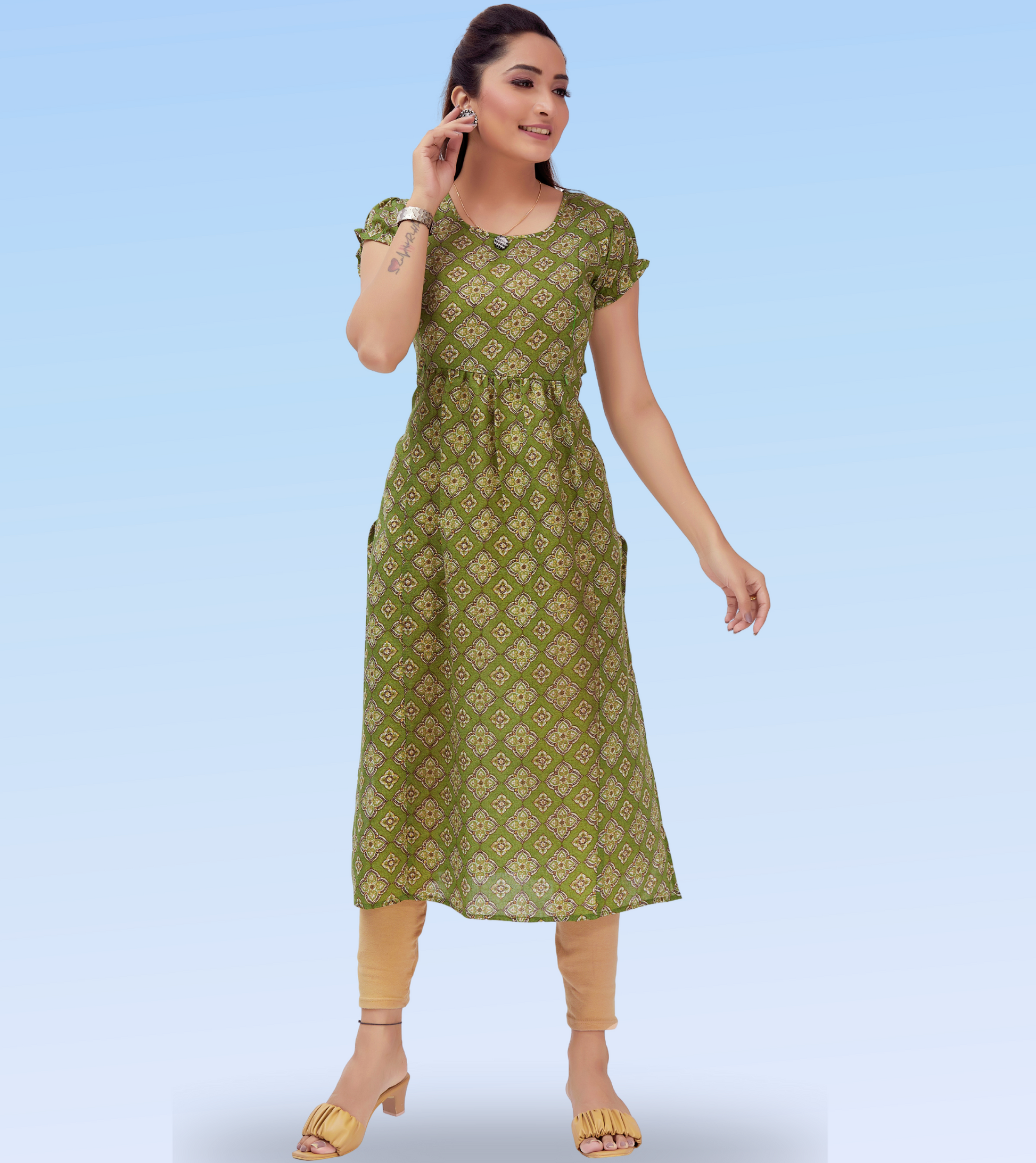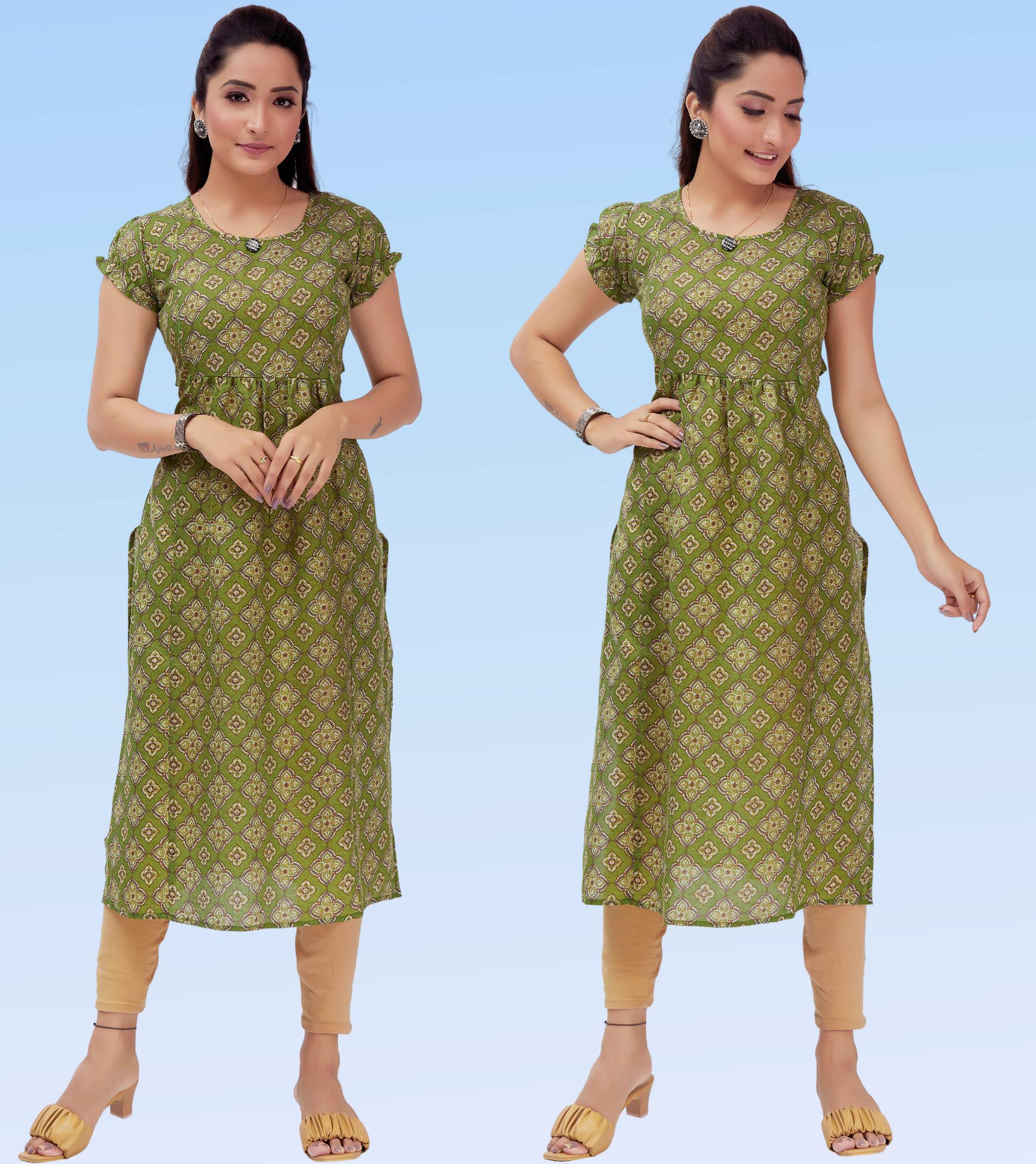 Amusing Green Cotton Blend Printed Straight Feeding Kurta