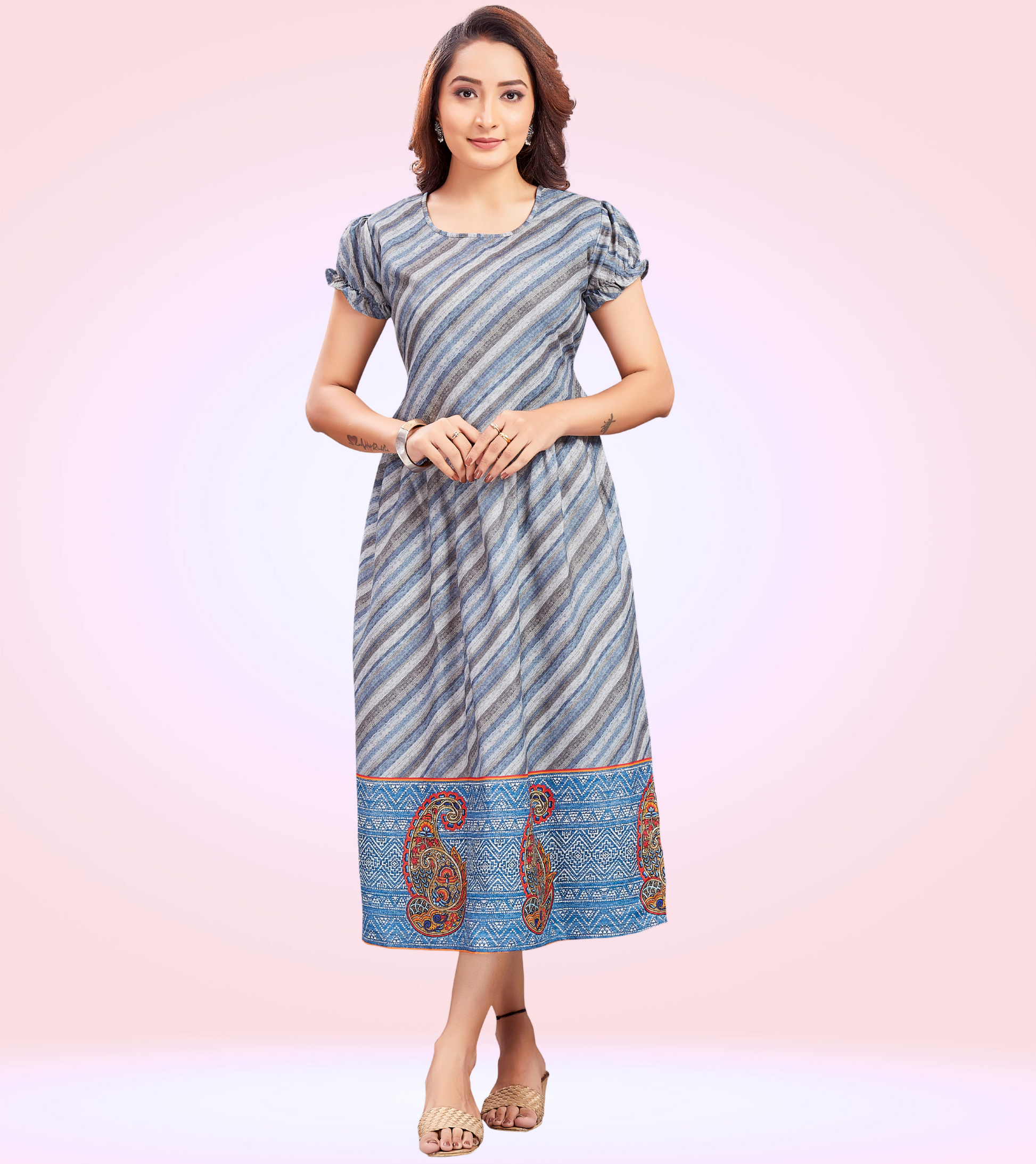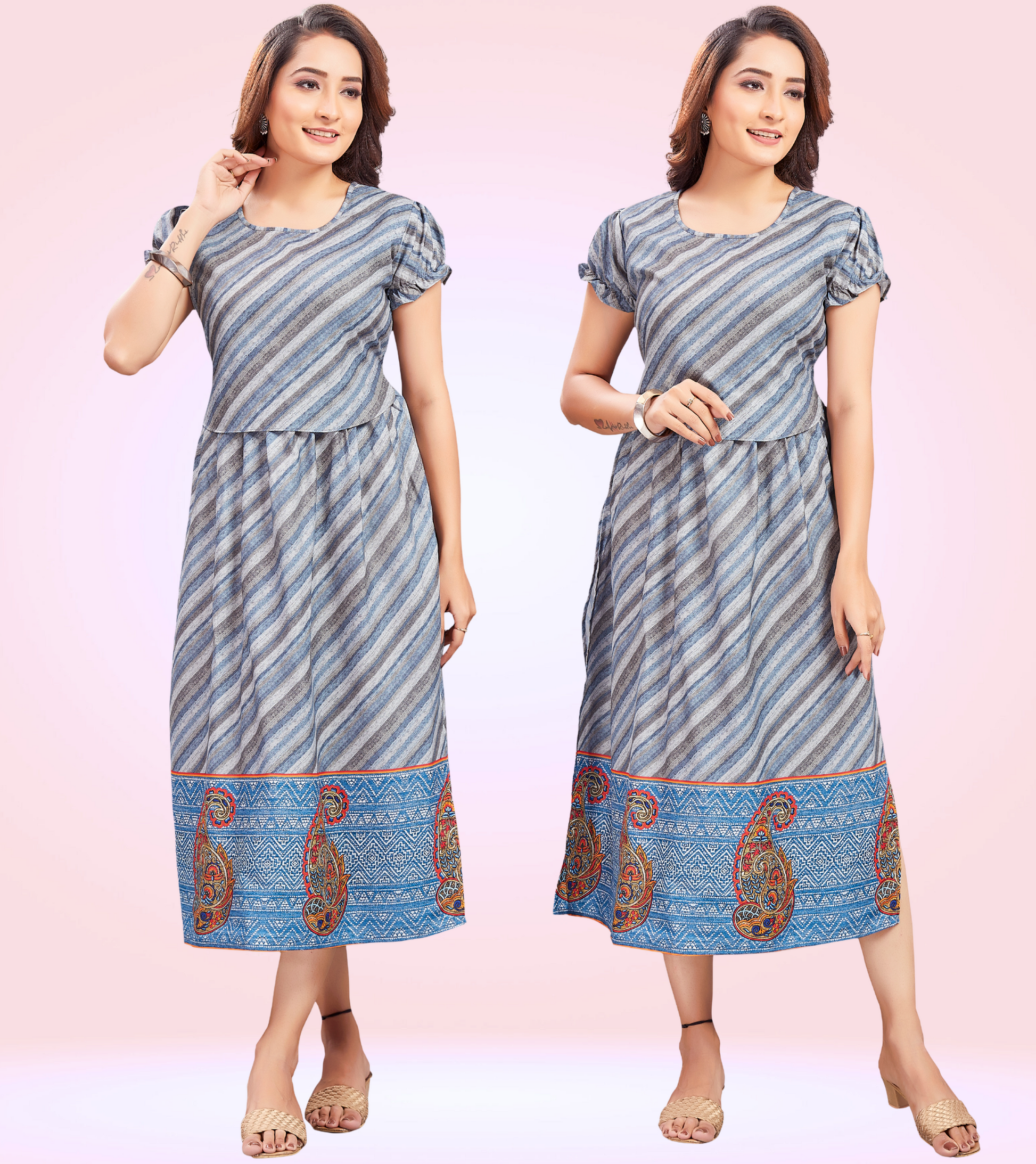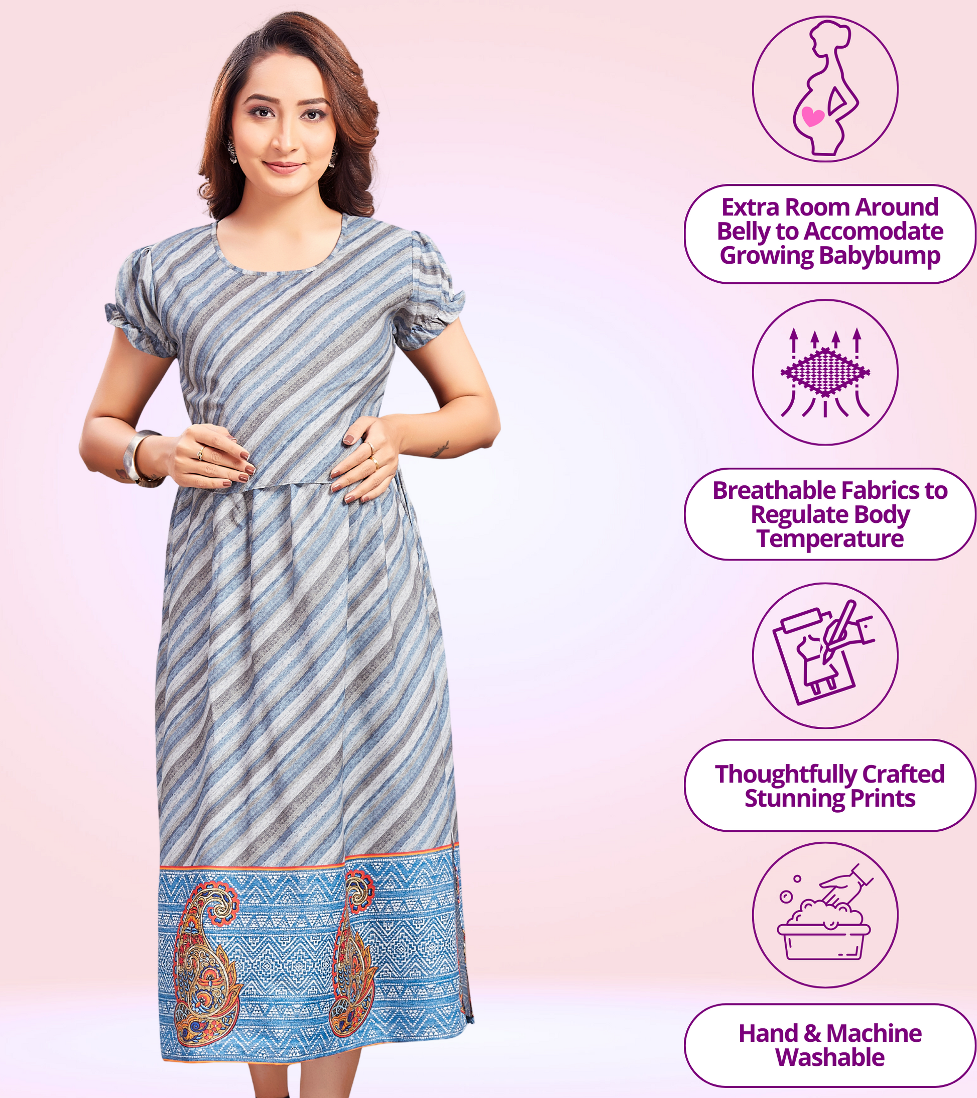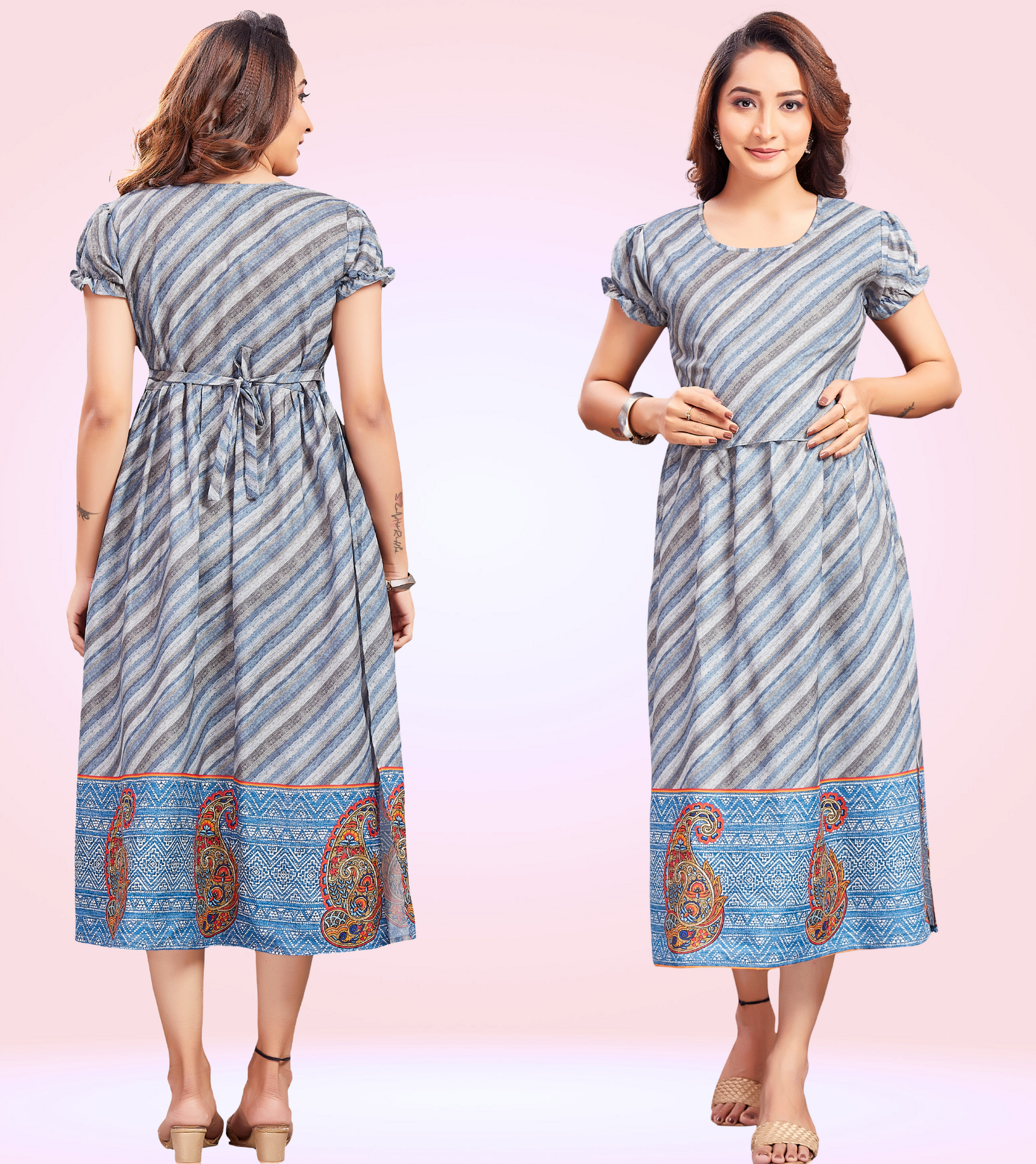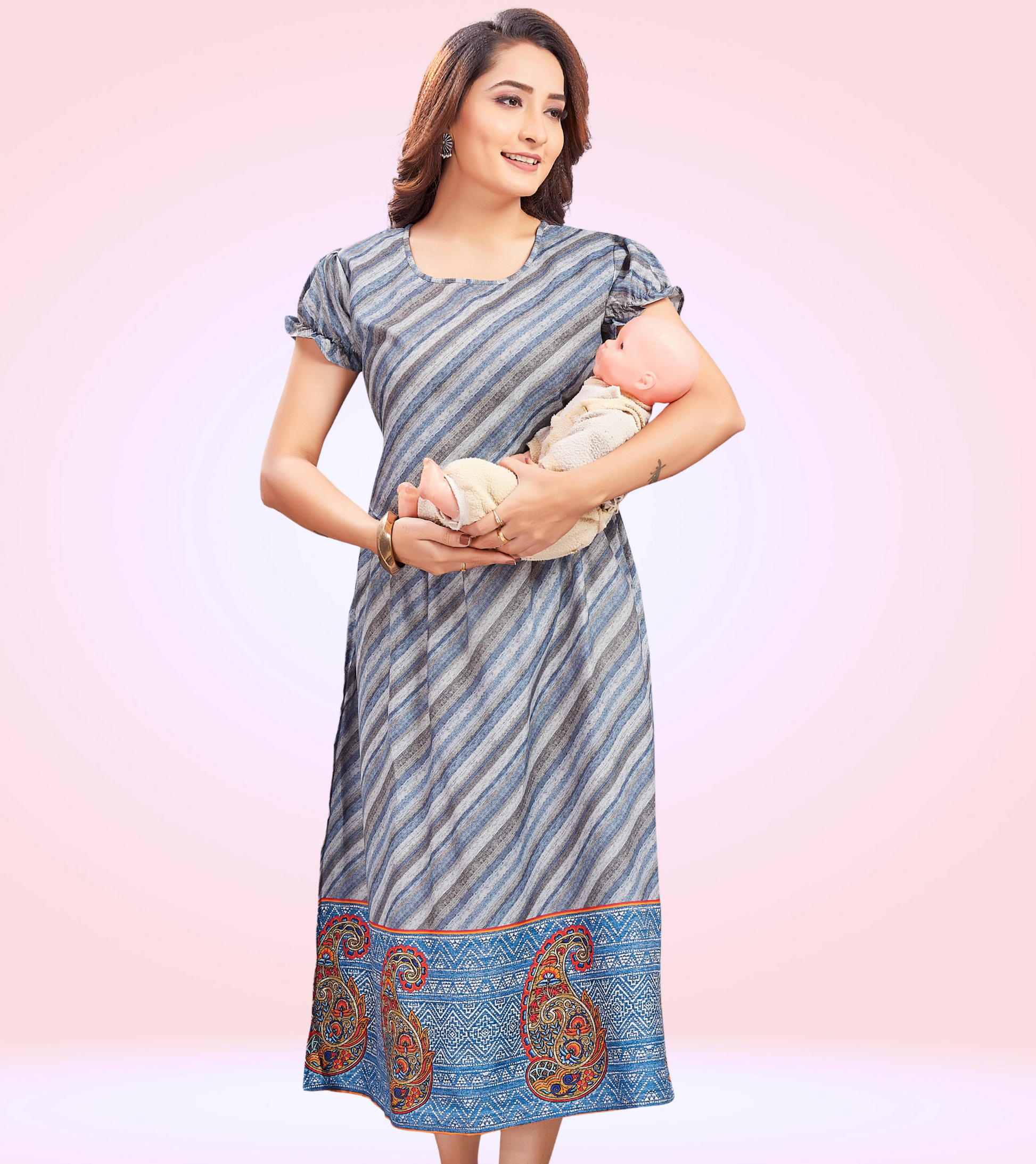 Stunning Blue Cotton Printed Flared Feeding Kurta