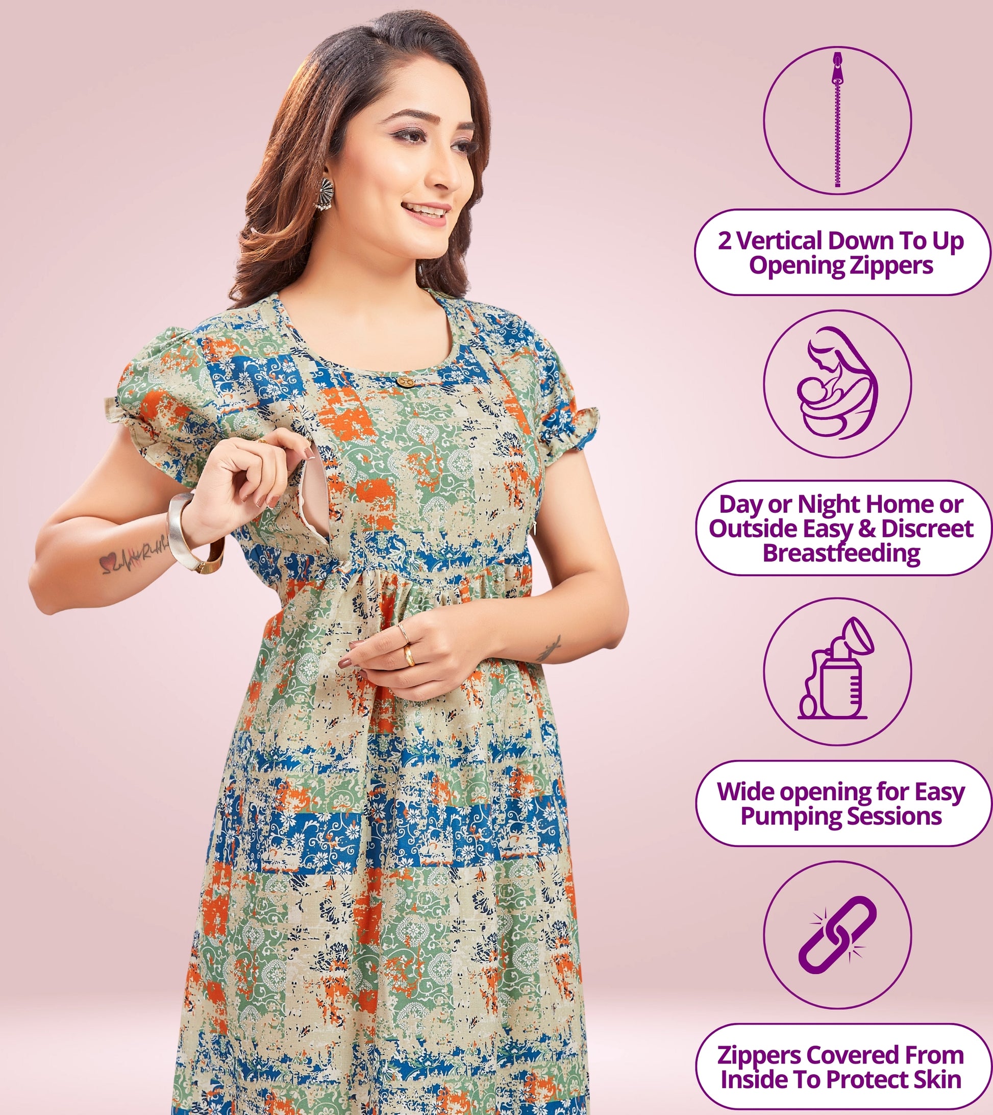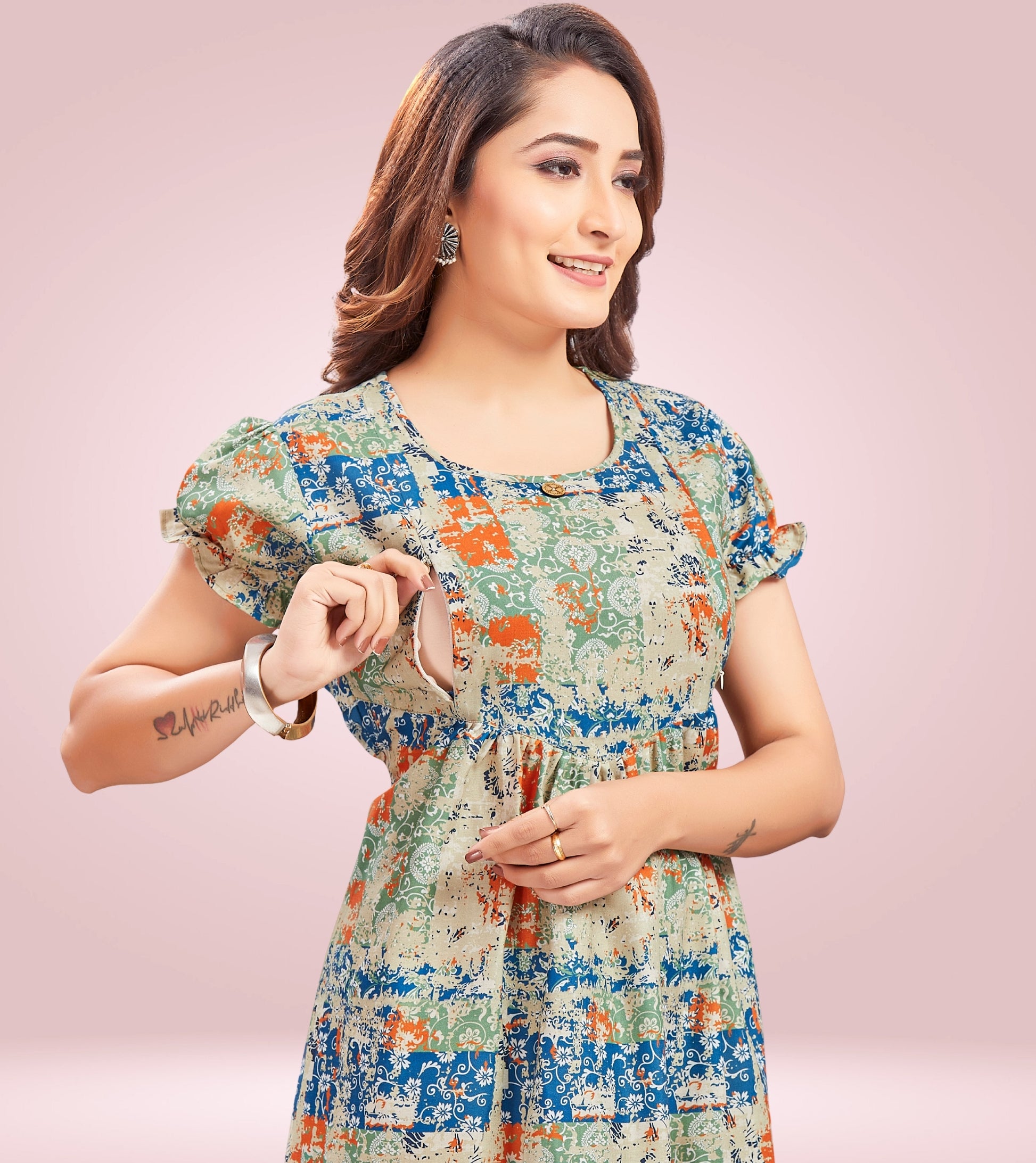 Stunning Blue Cotton Printed Flared Feeding Kurta