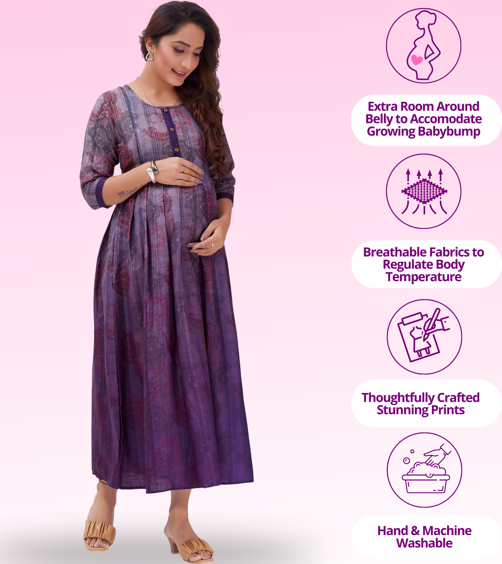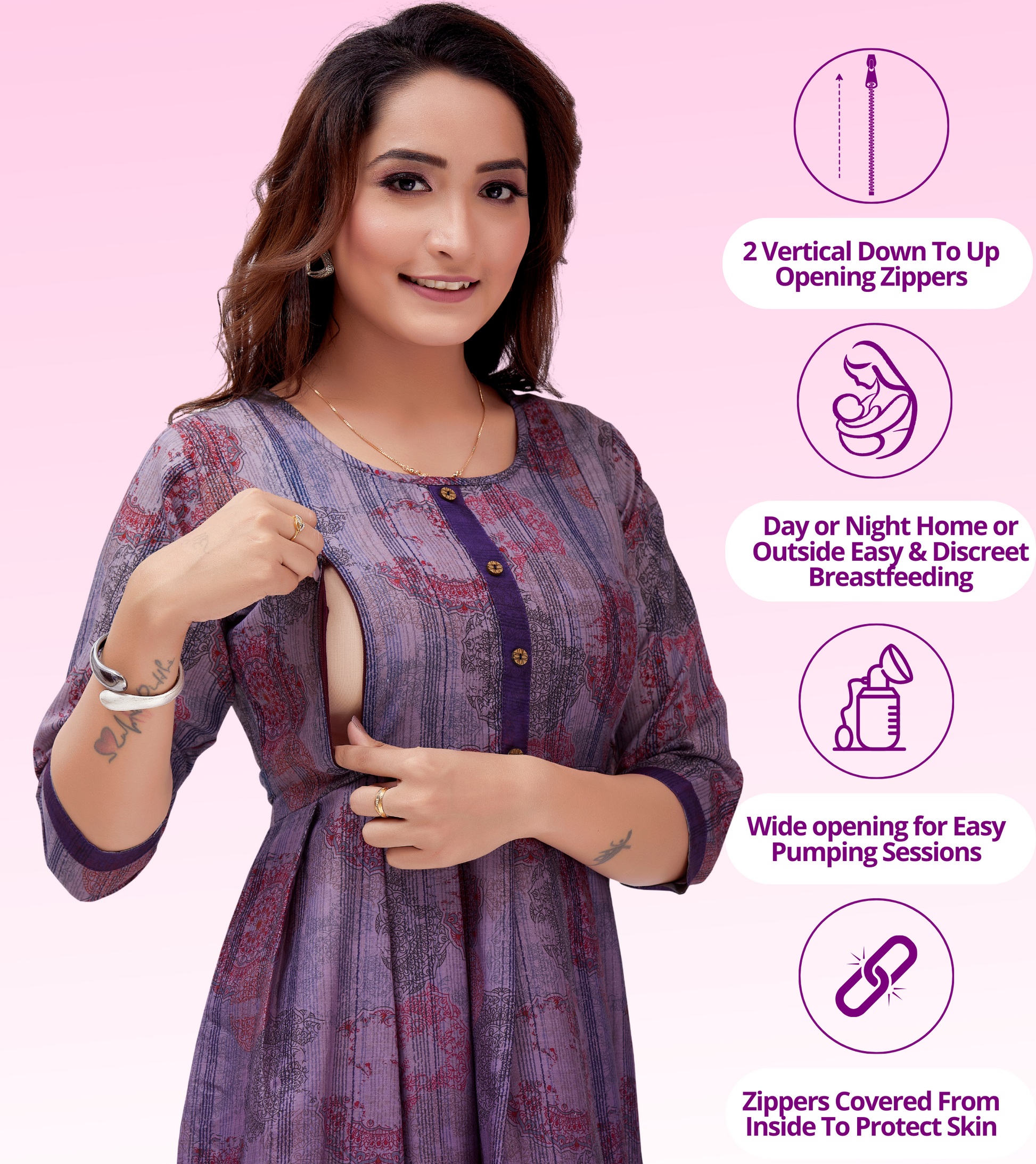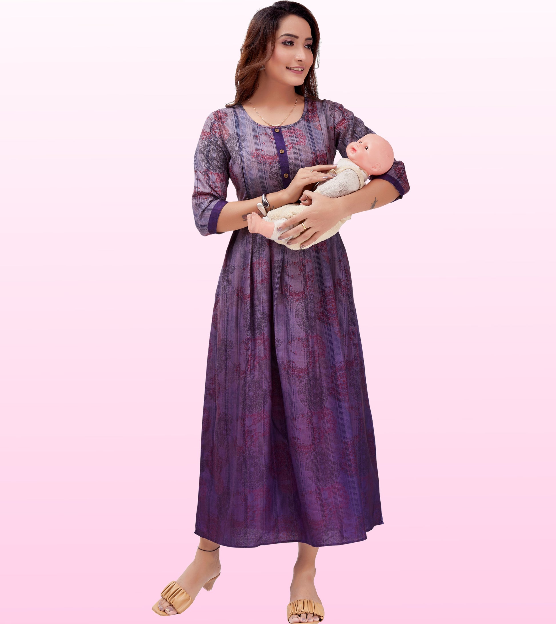 Classy Purple Cotton Printed Flared Zipless Feeding Kurta