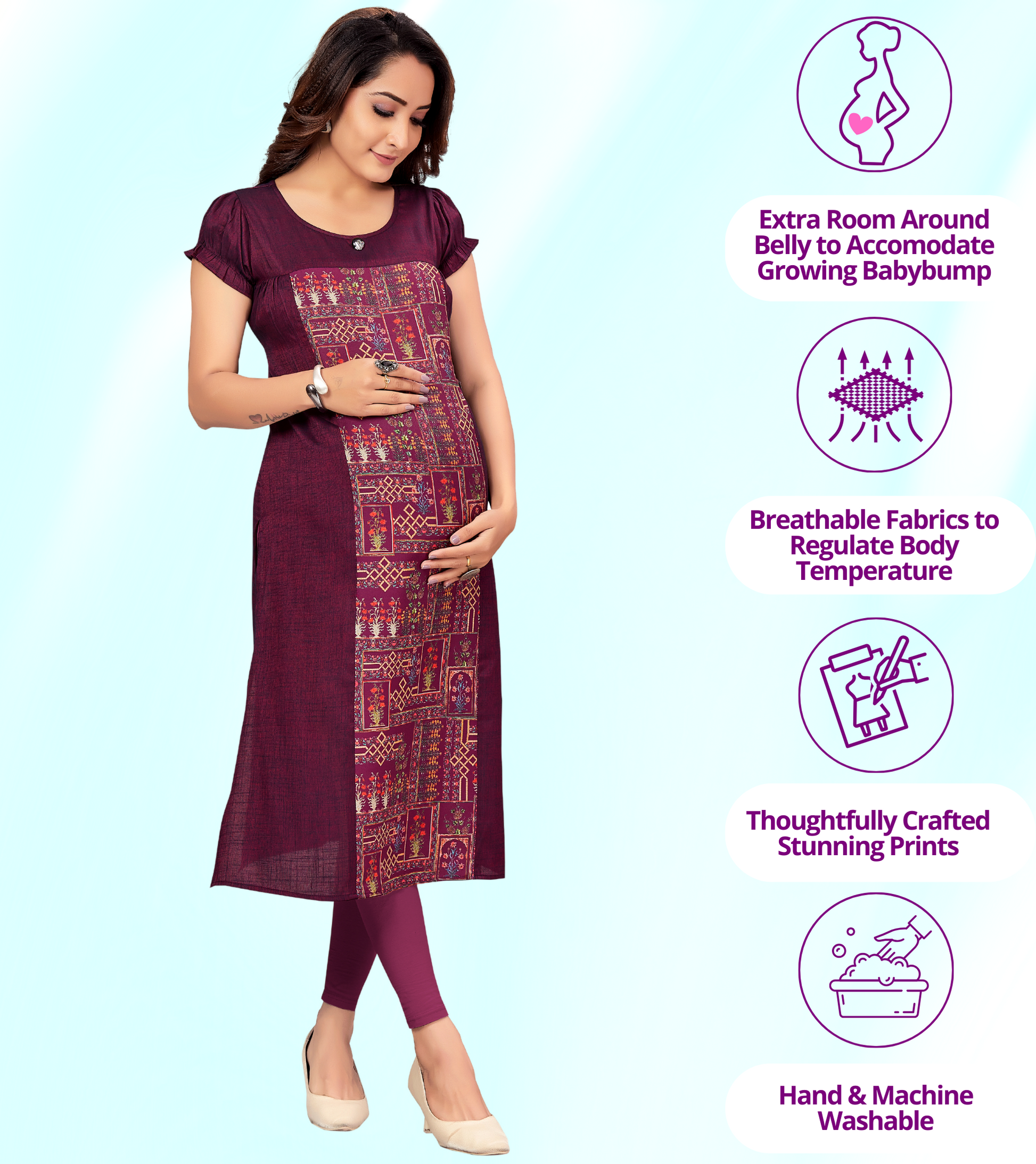 Dusty Wine Cotton Printed Flared Feeding Kurta