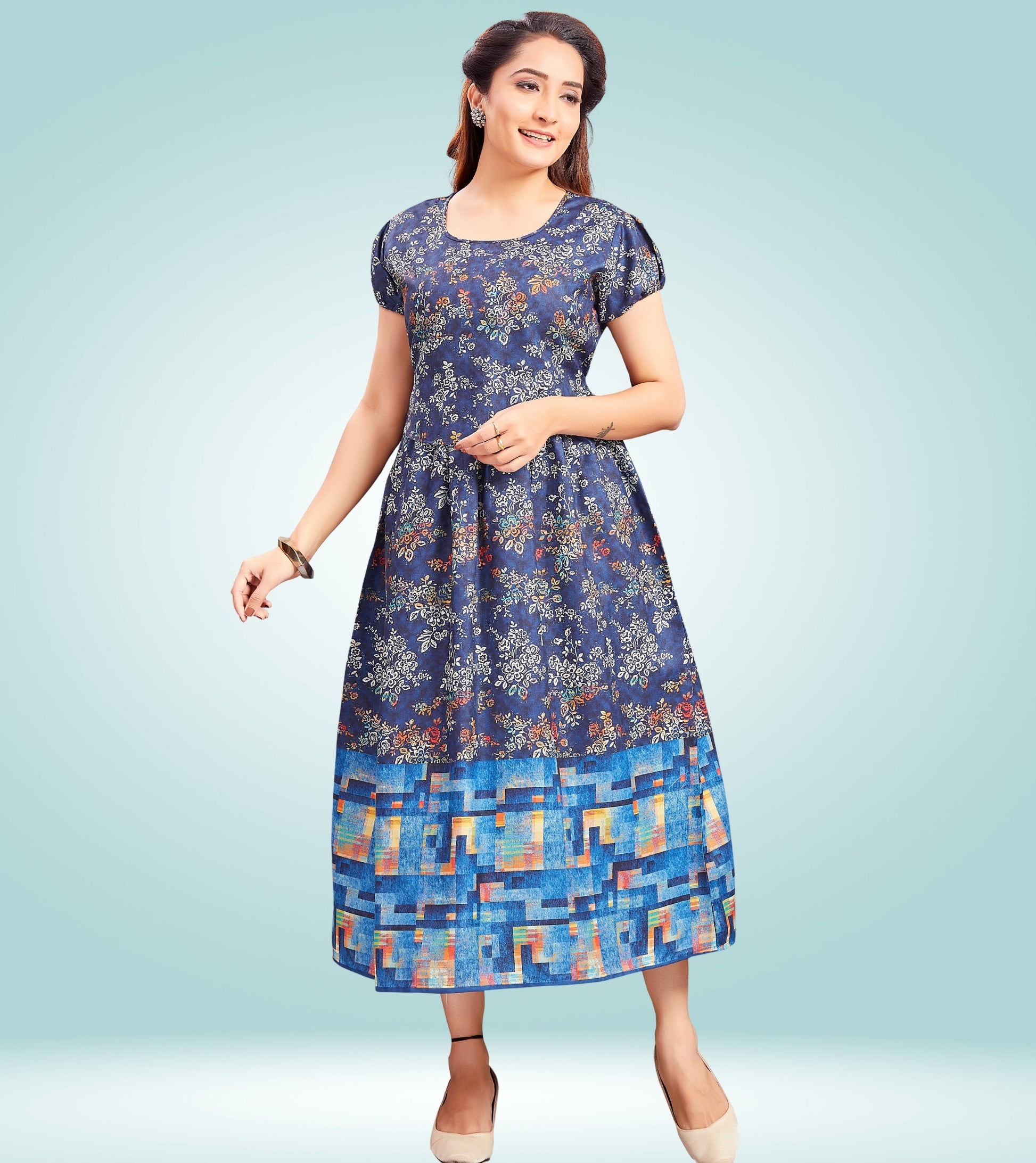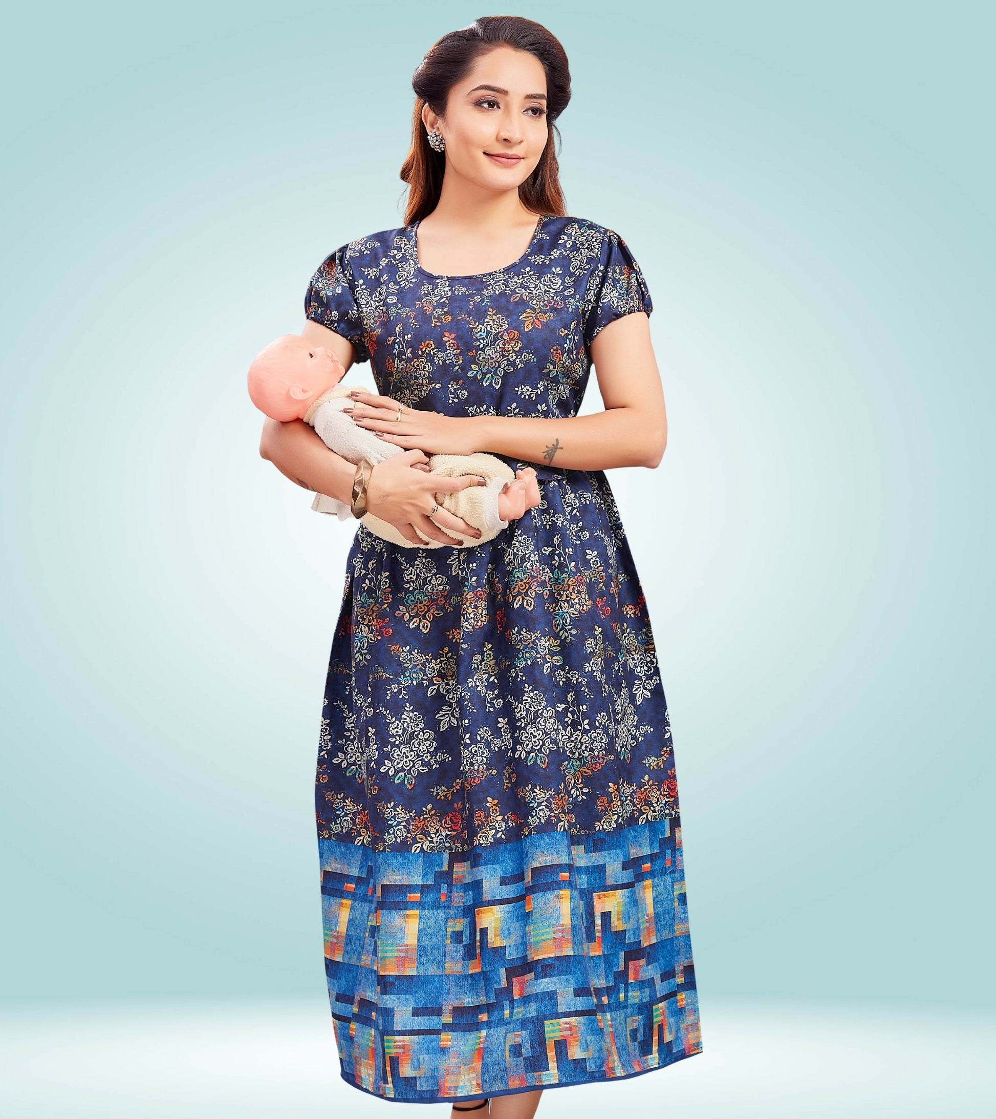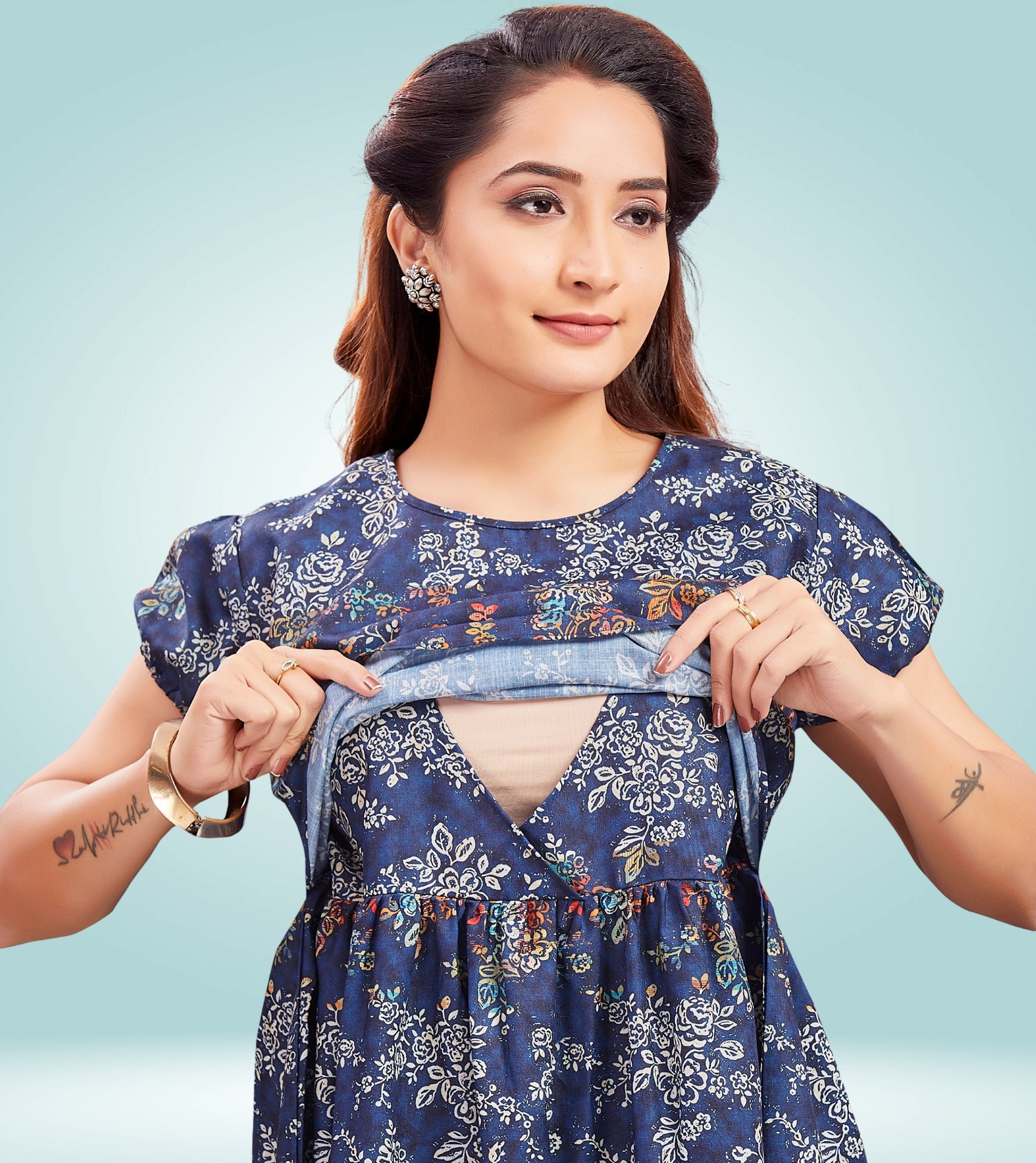 Stunning Blue Cotton Printed Flared Feeding Kurta