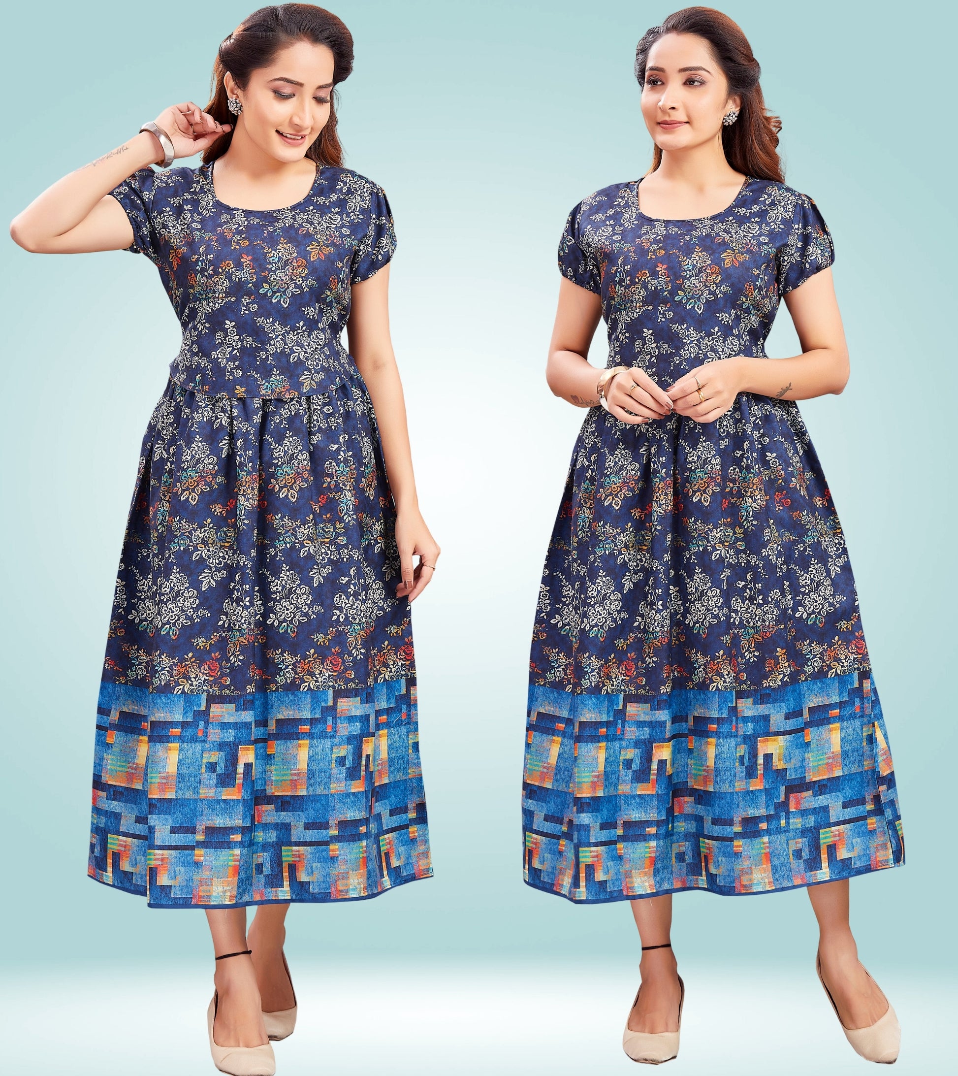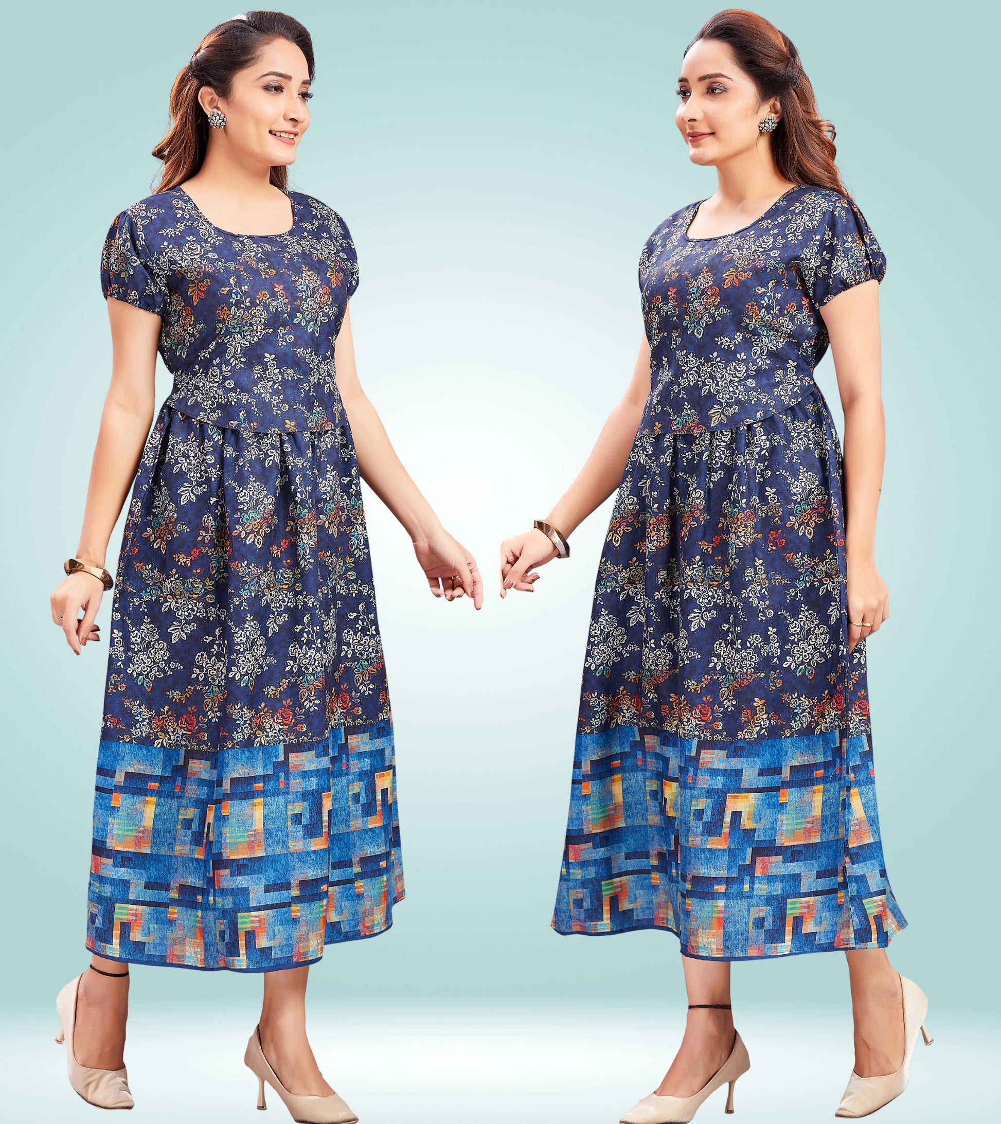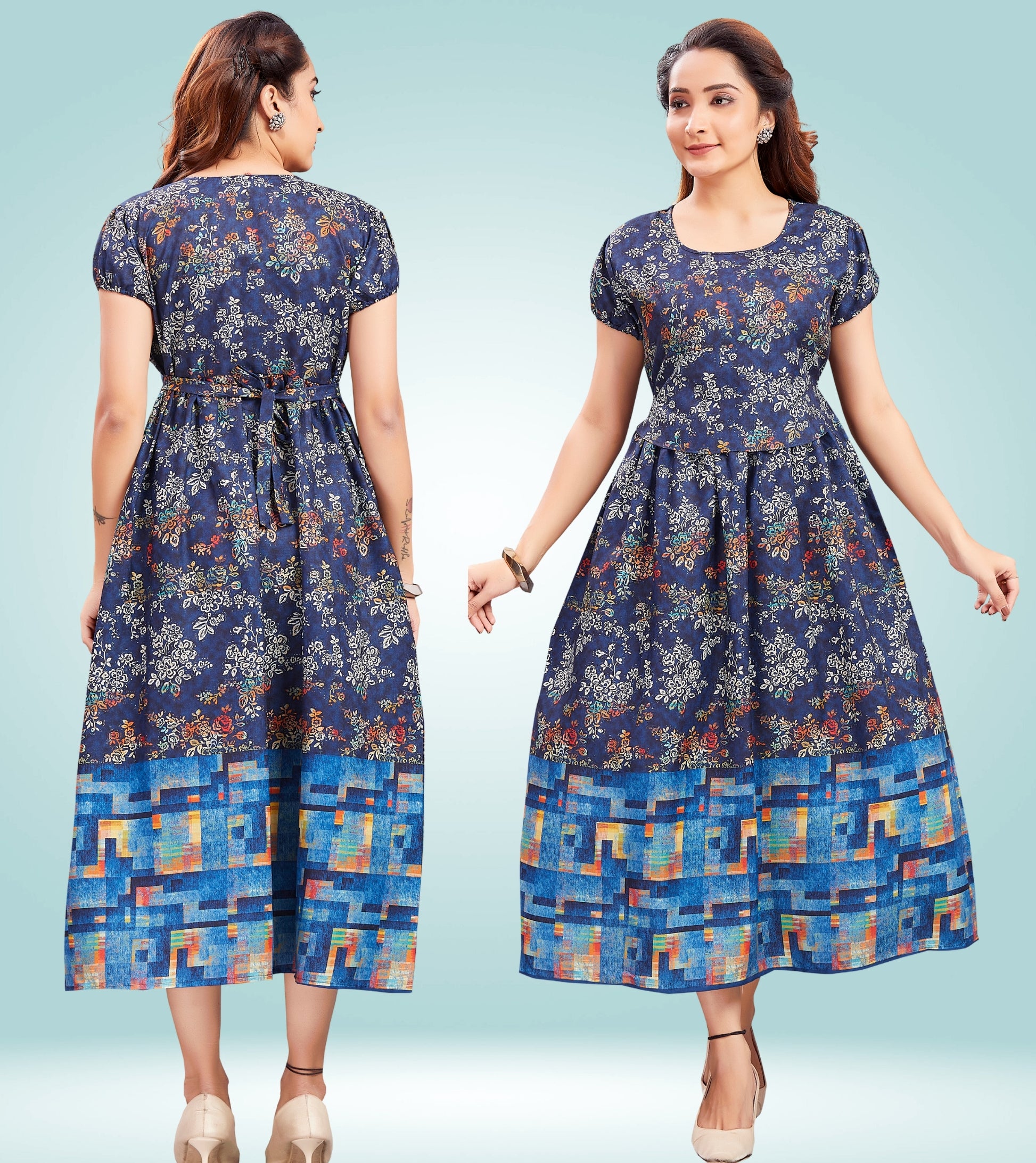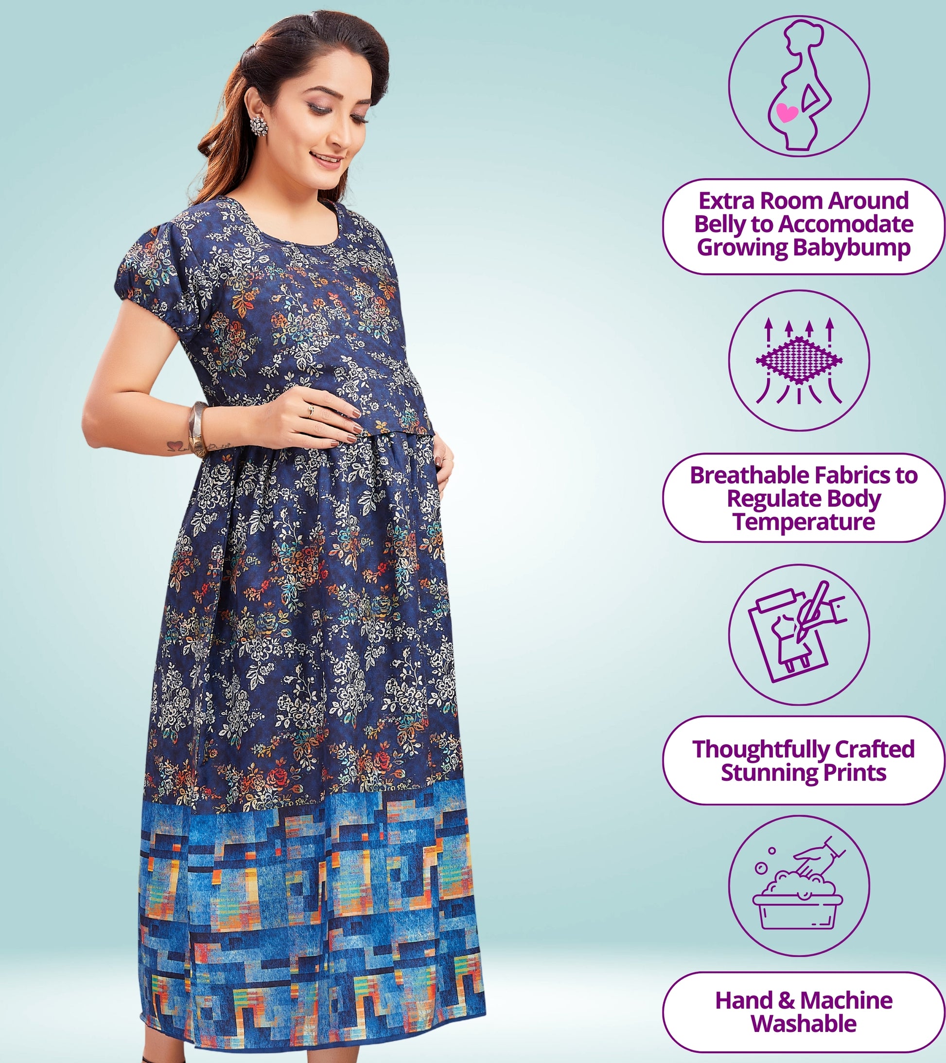 Stunning Blue Cotton Printed Flared Feeding Kurta