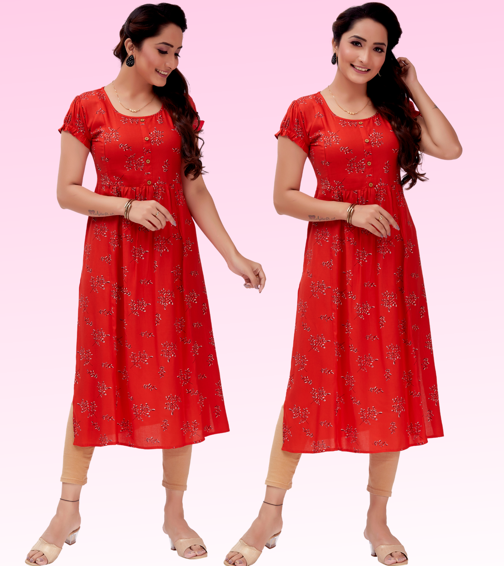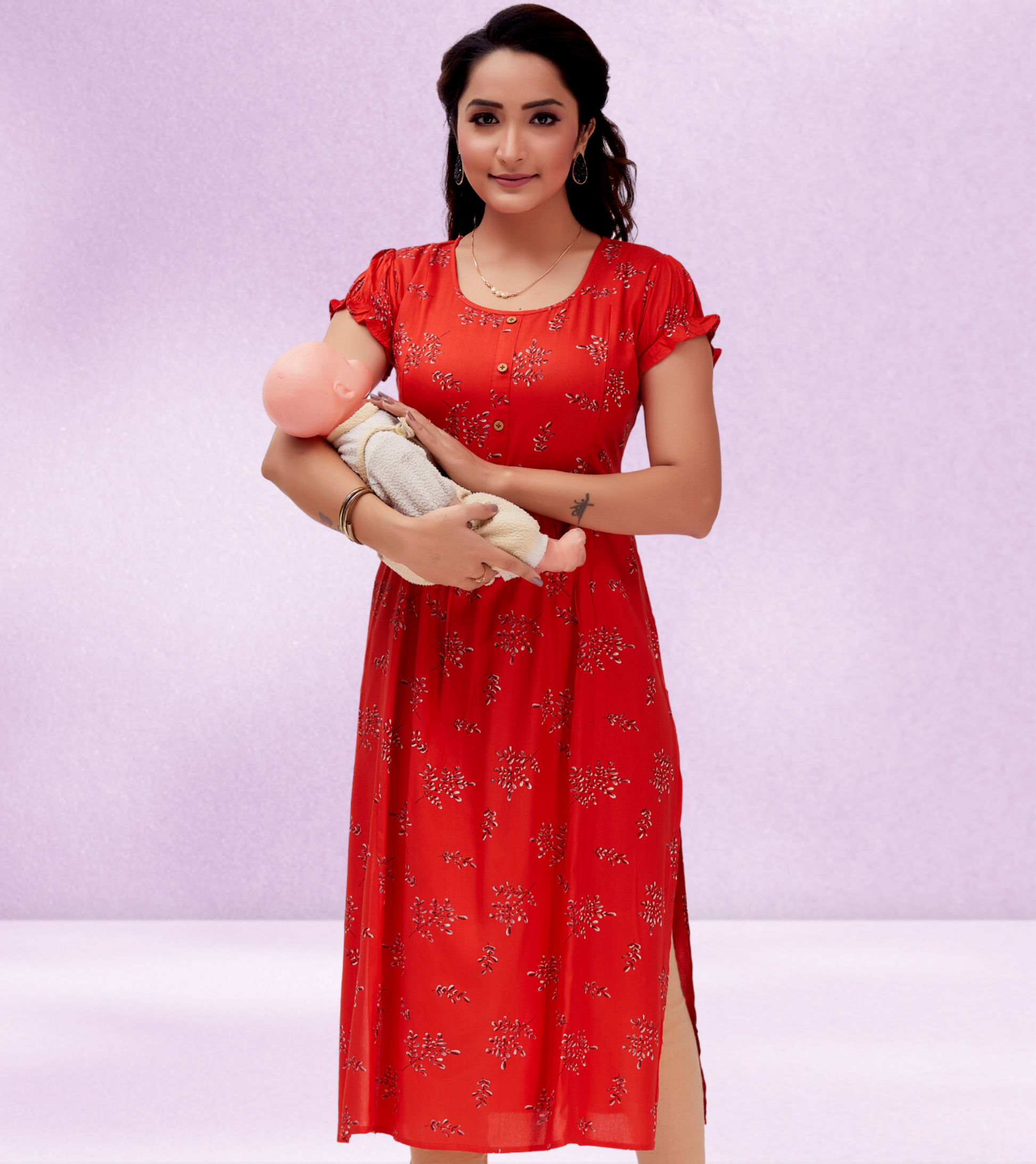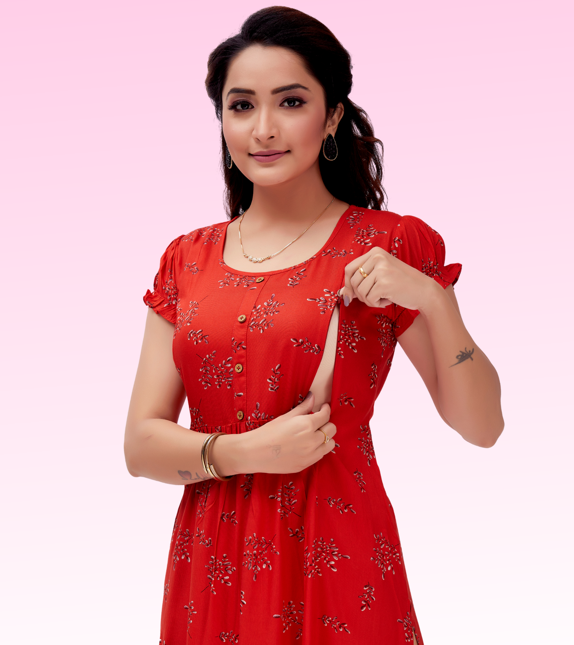 Fawny Red Cotton Printed Flared Zipless Feeding Kurta