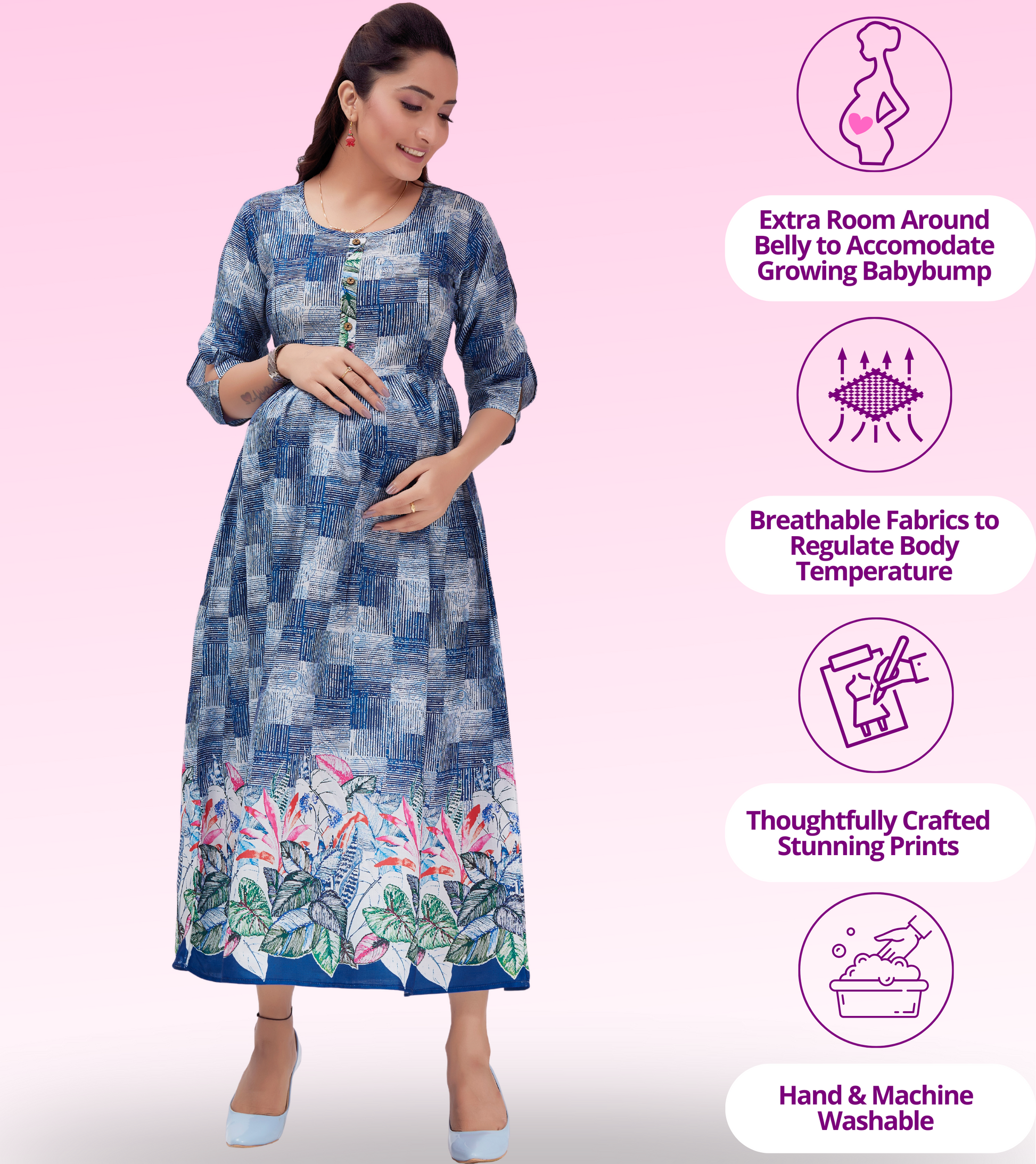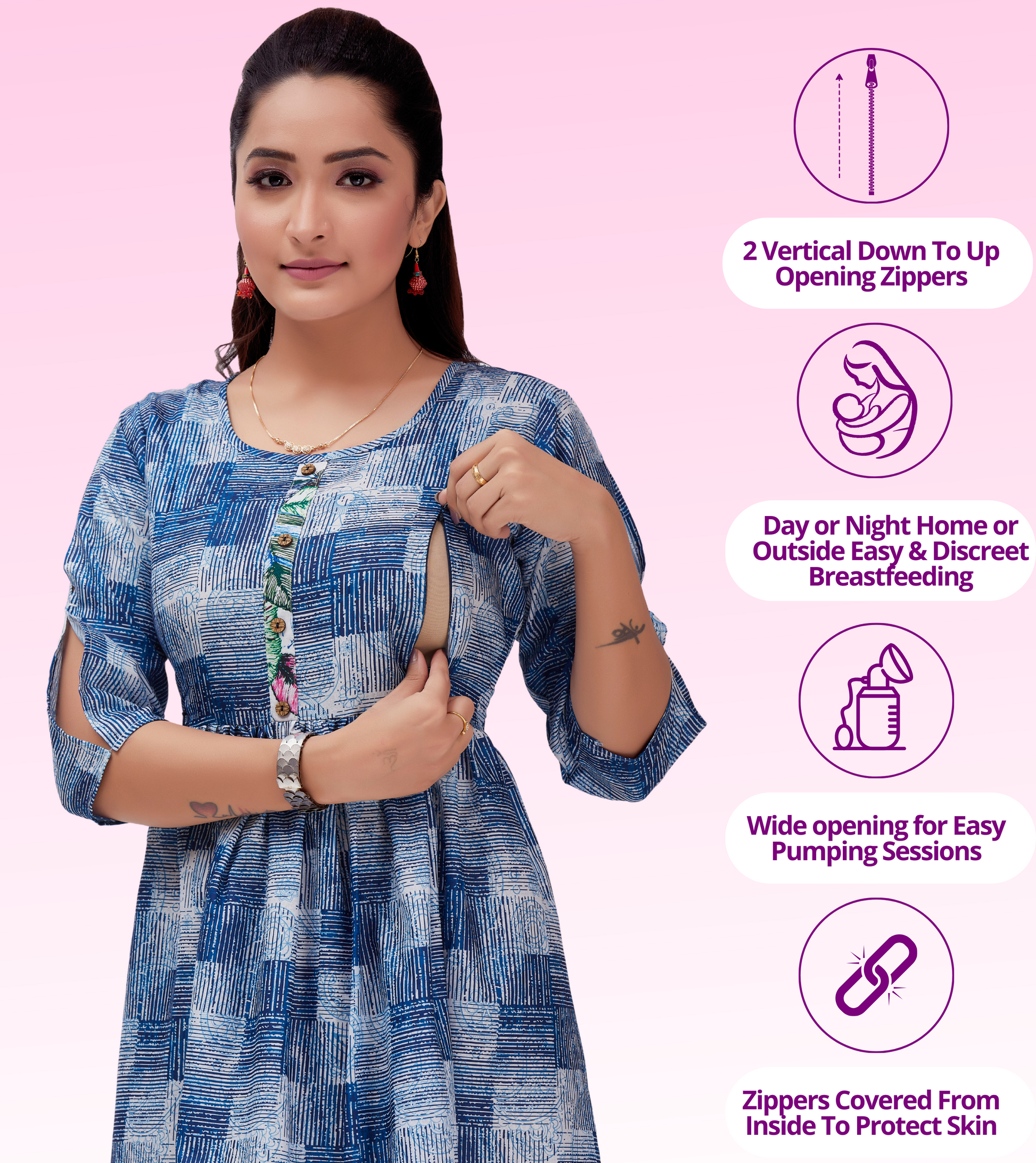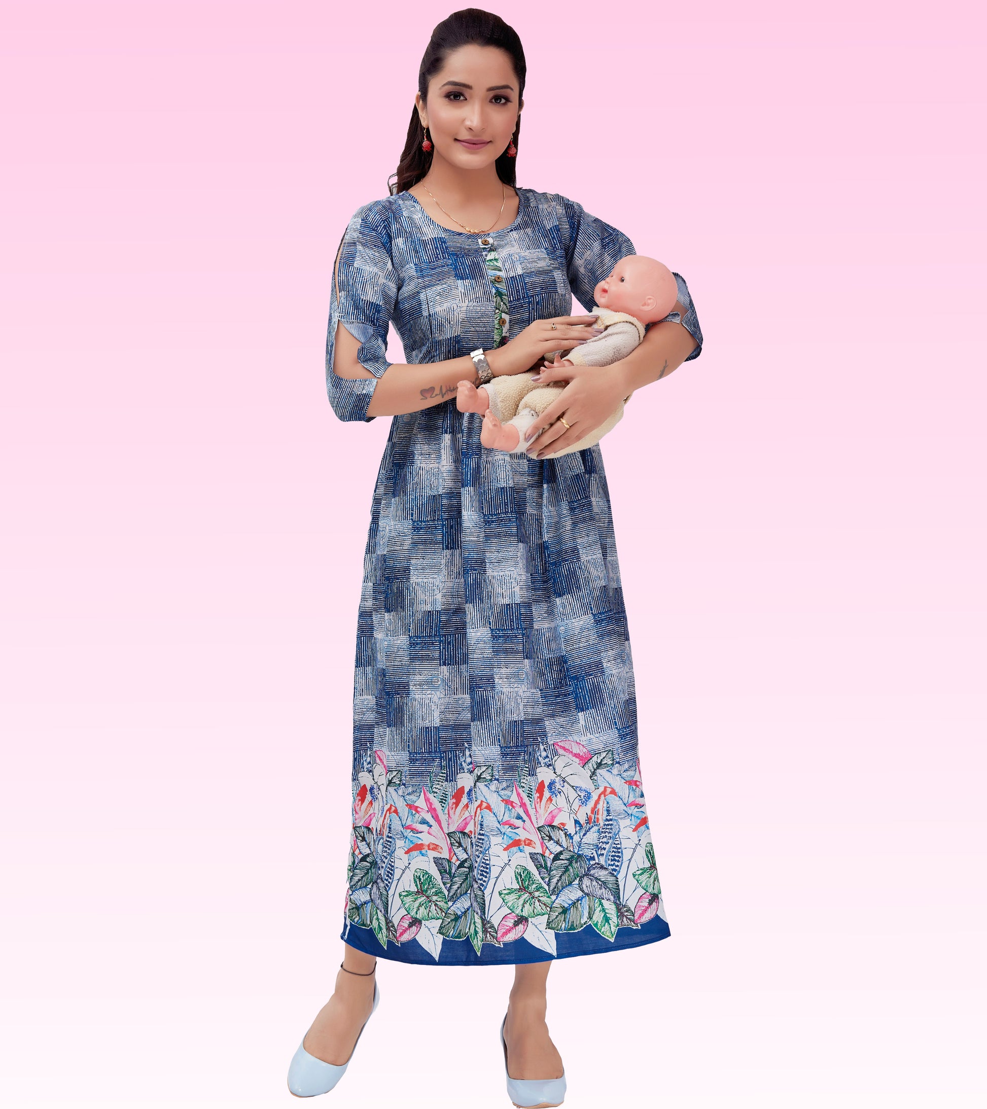 Stunning Blue Cotton Printed Flared Feeding Kurta