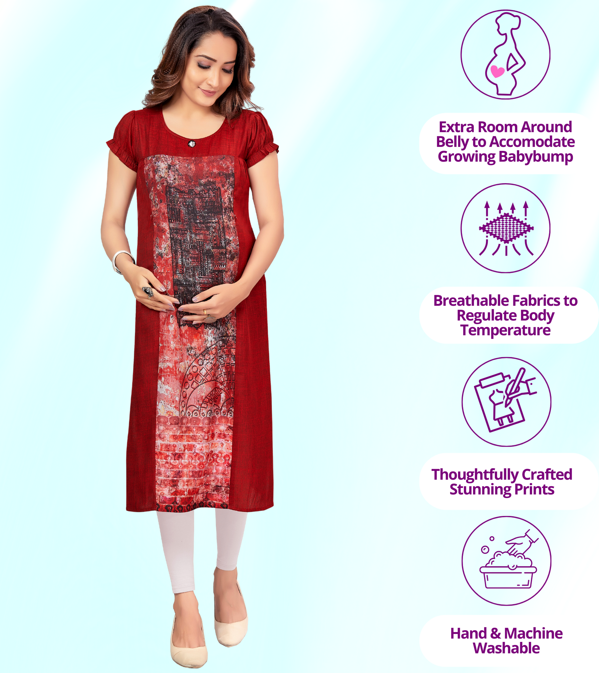 Fawny Red Cotton Printed Flared Zipless Feeding Kurta