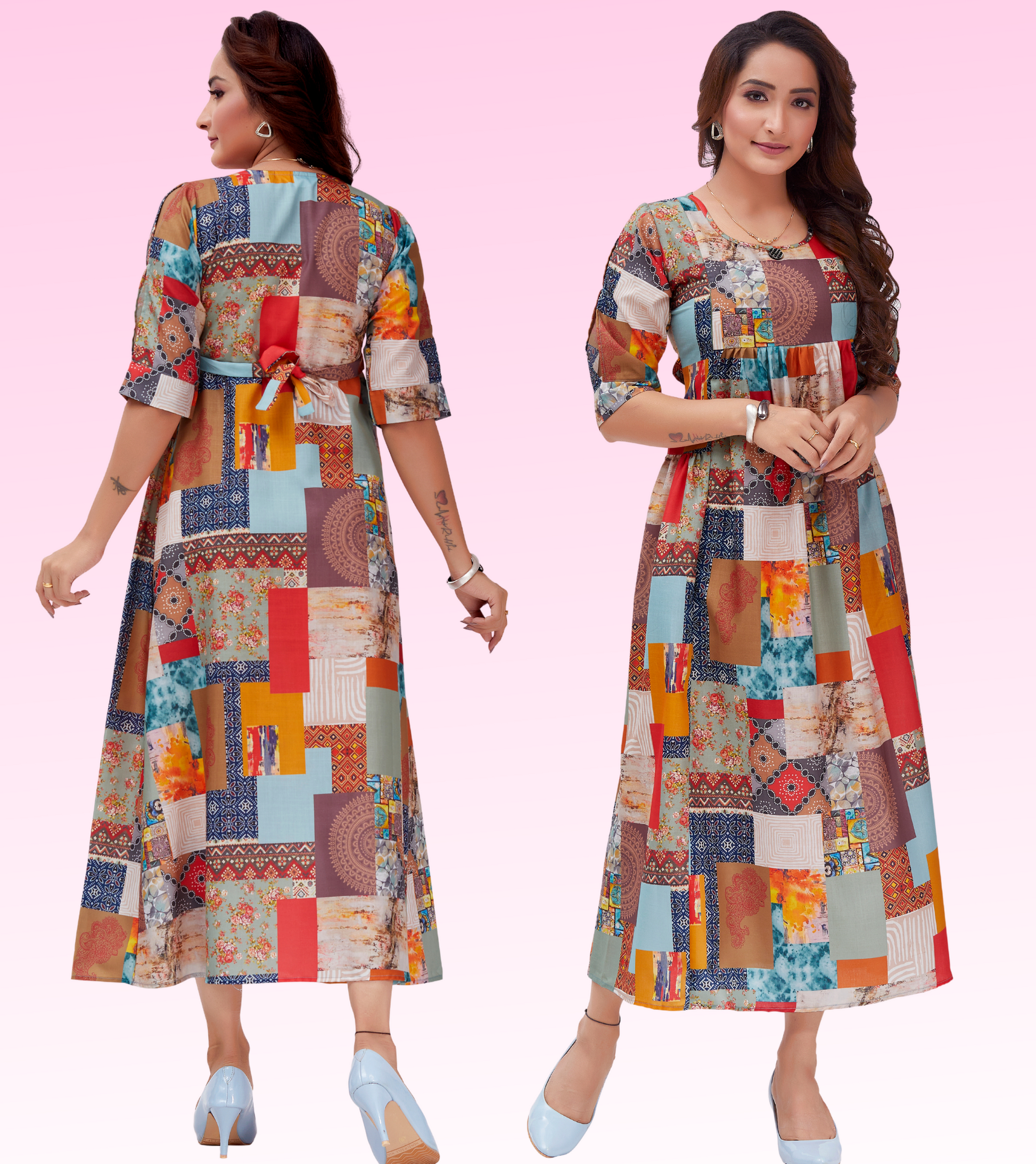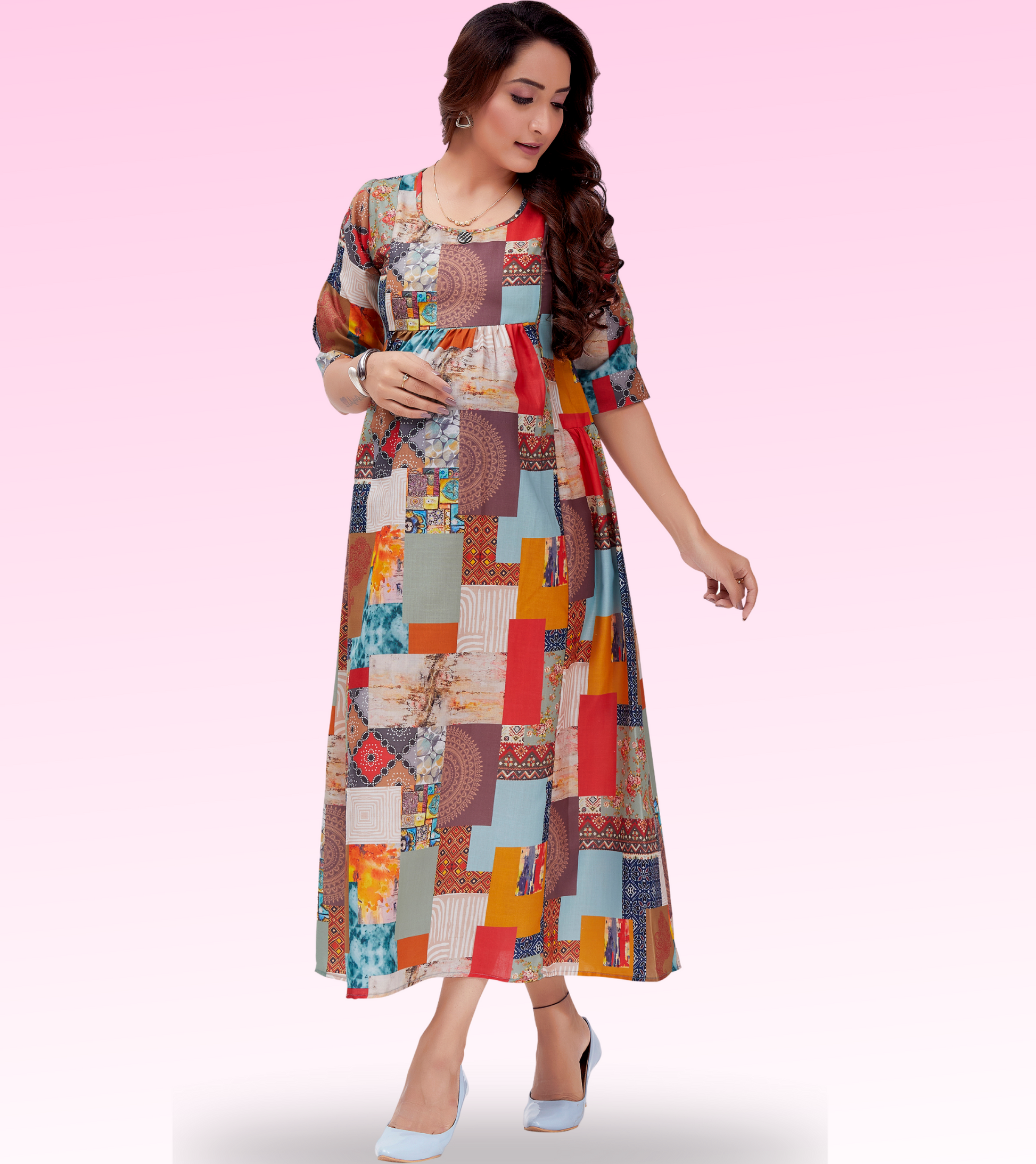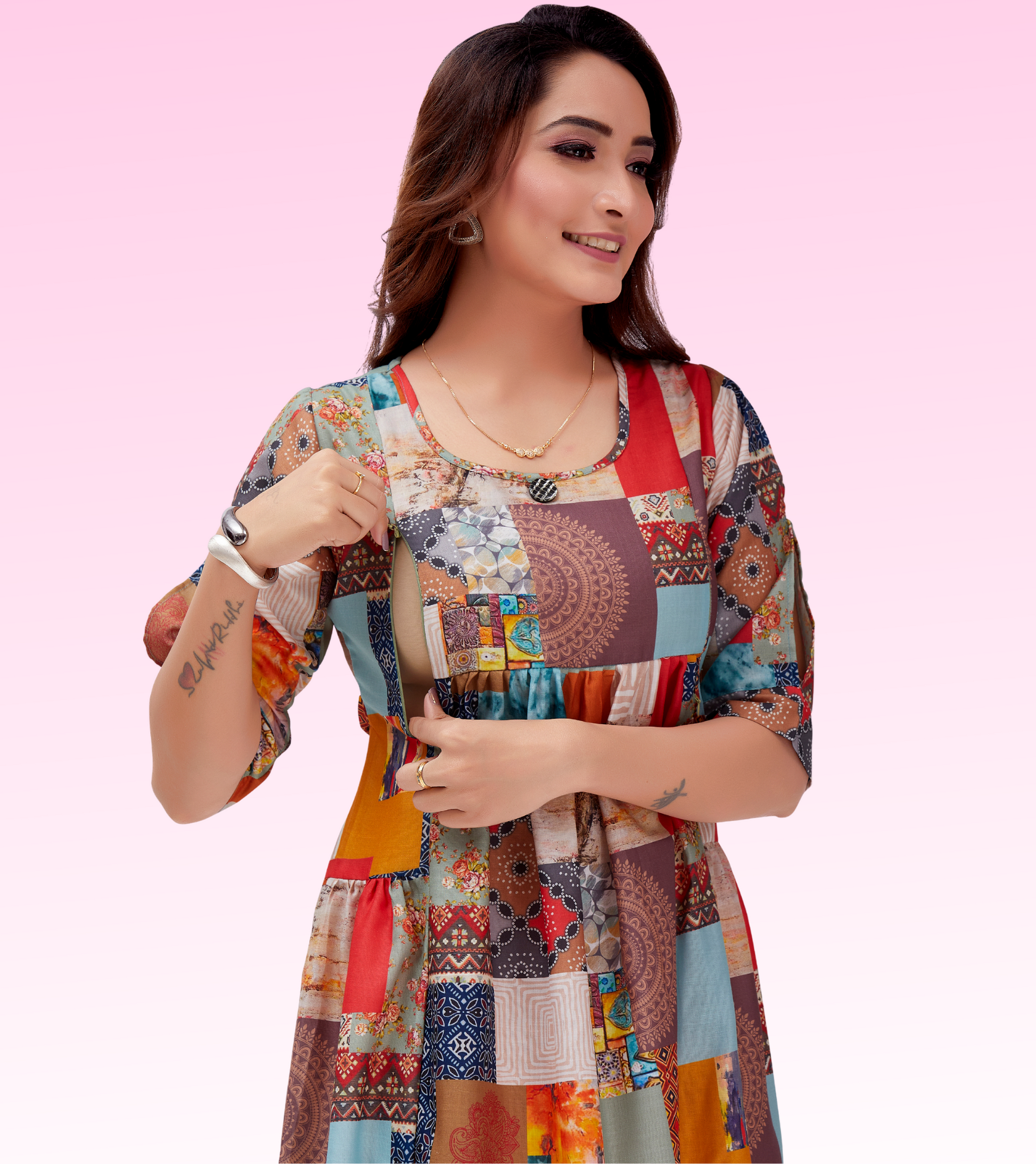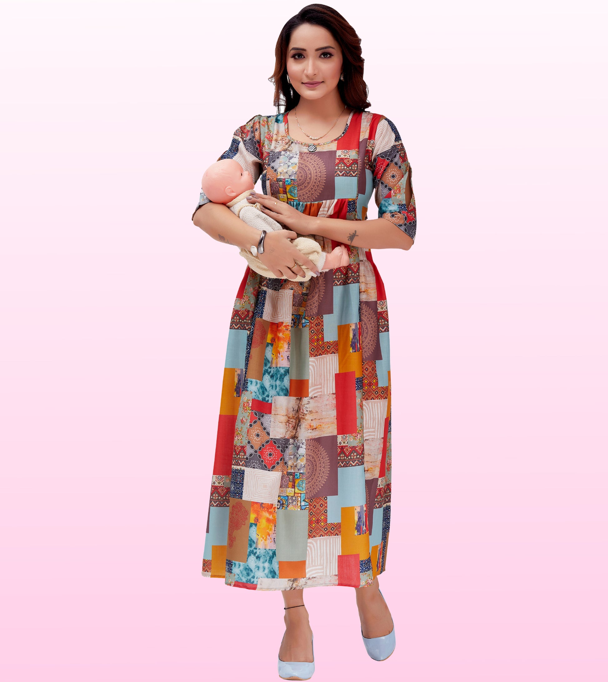 Multi Colour Cotton Printed Flared Feeding Kurta