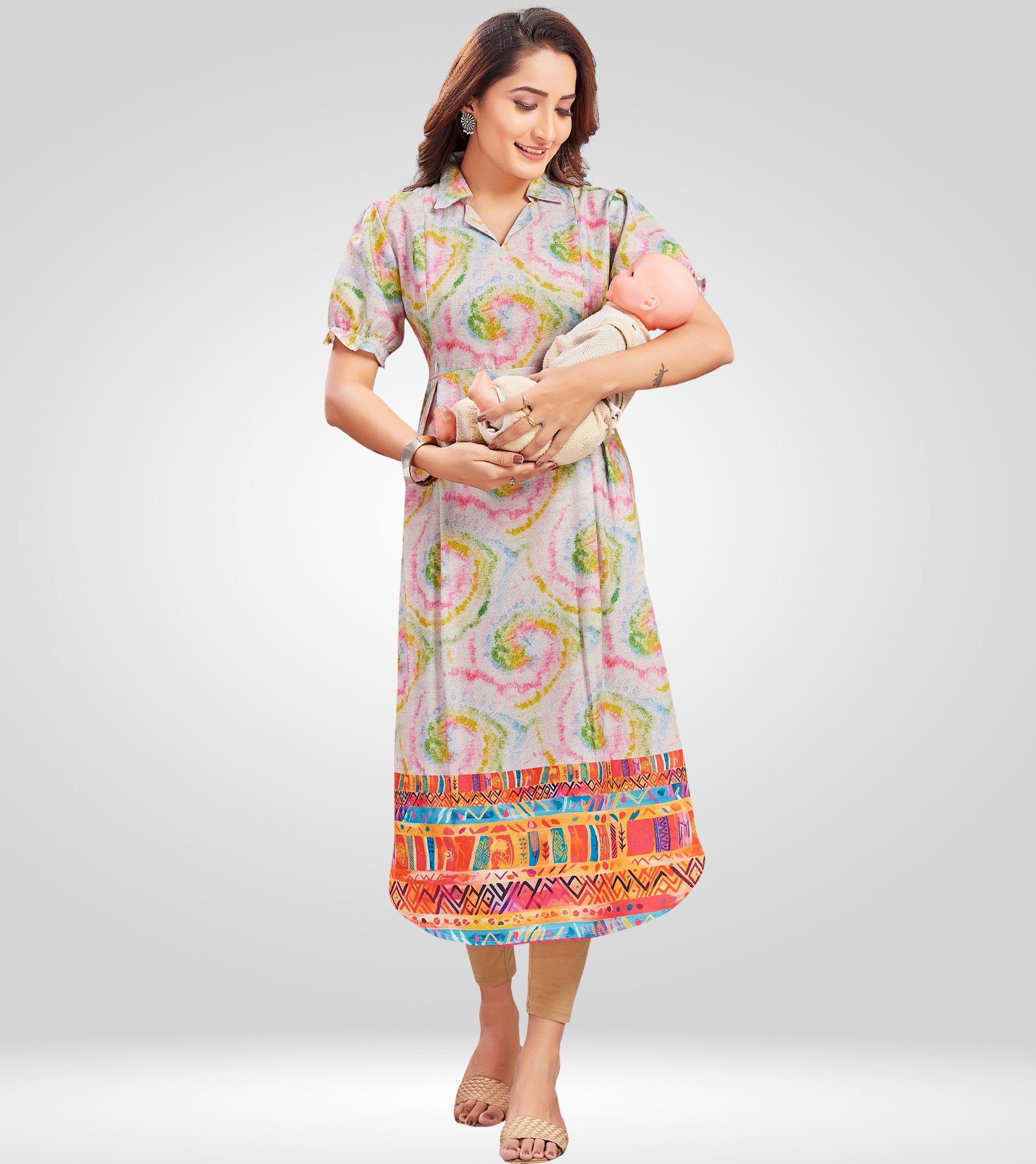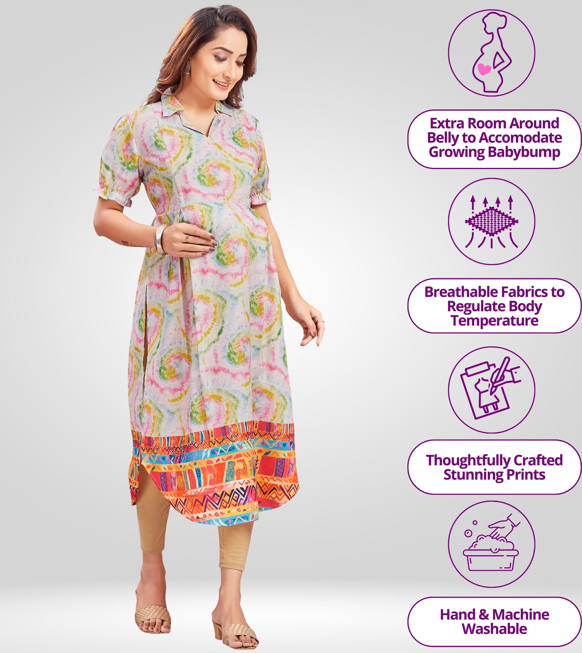 "Breastfeeding is so convenient with these kurtis. The fabric is breathable and the zippers are very practical."