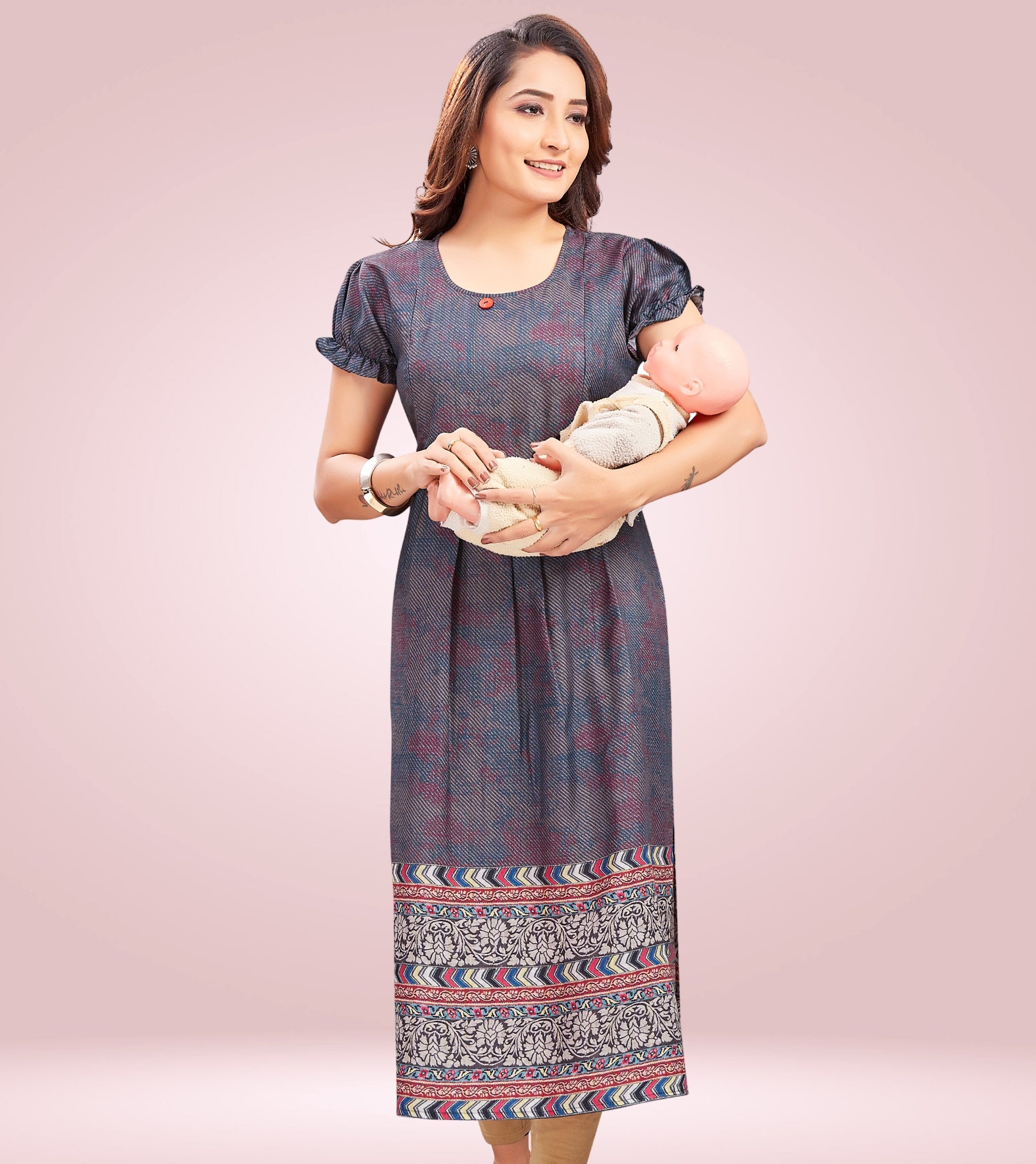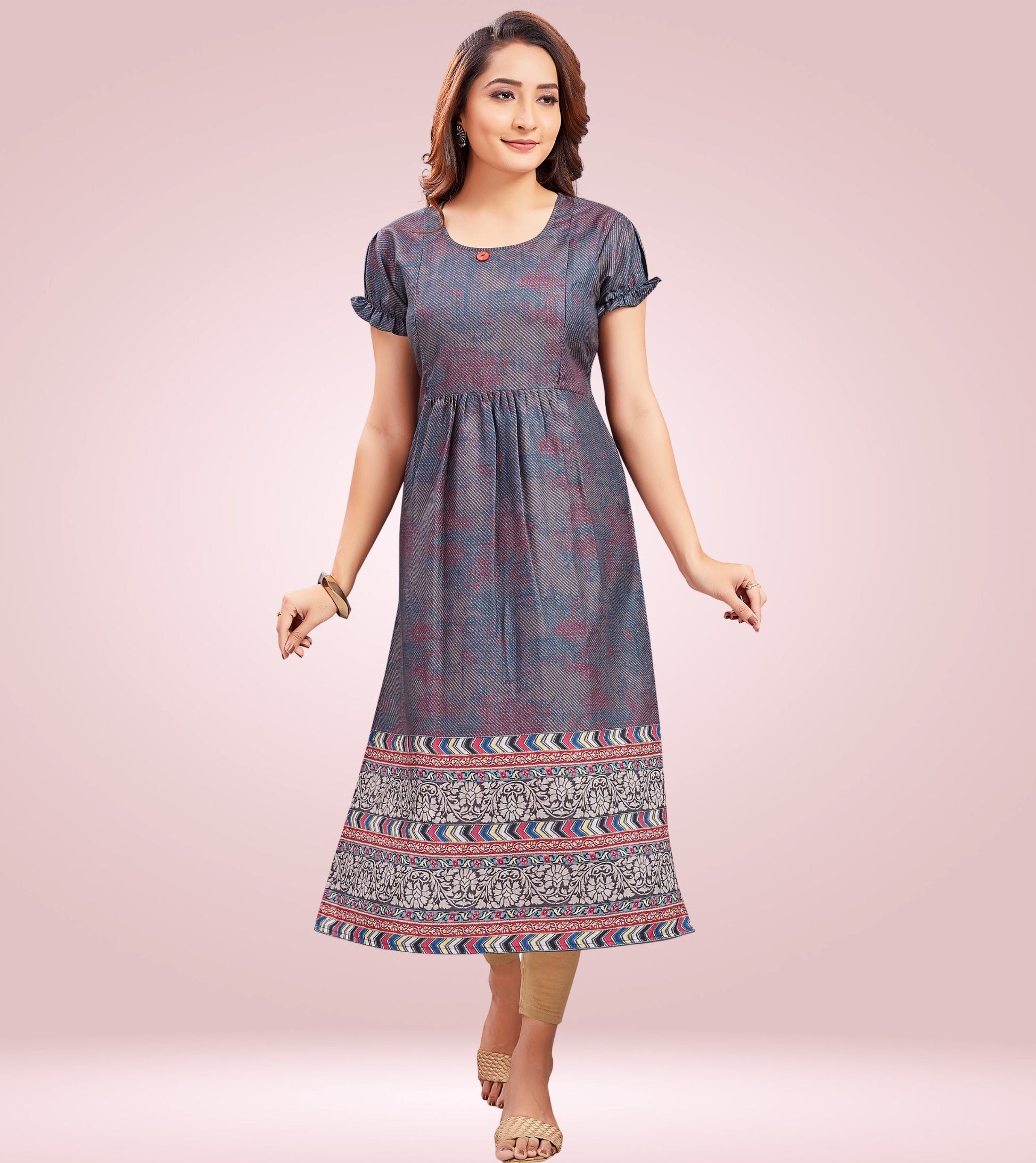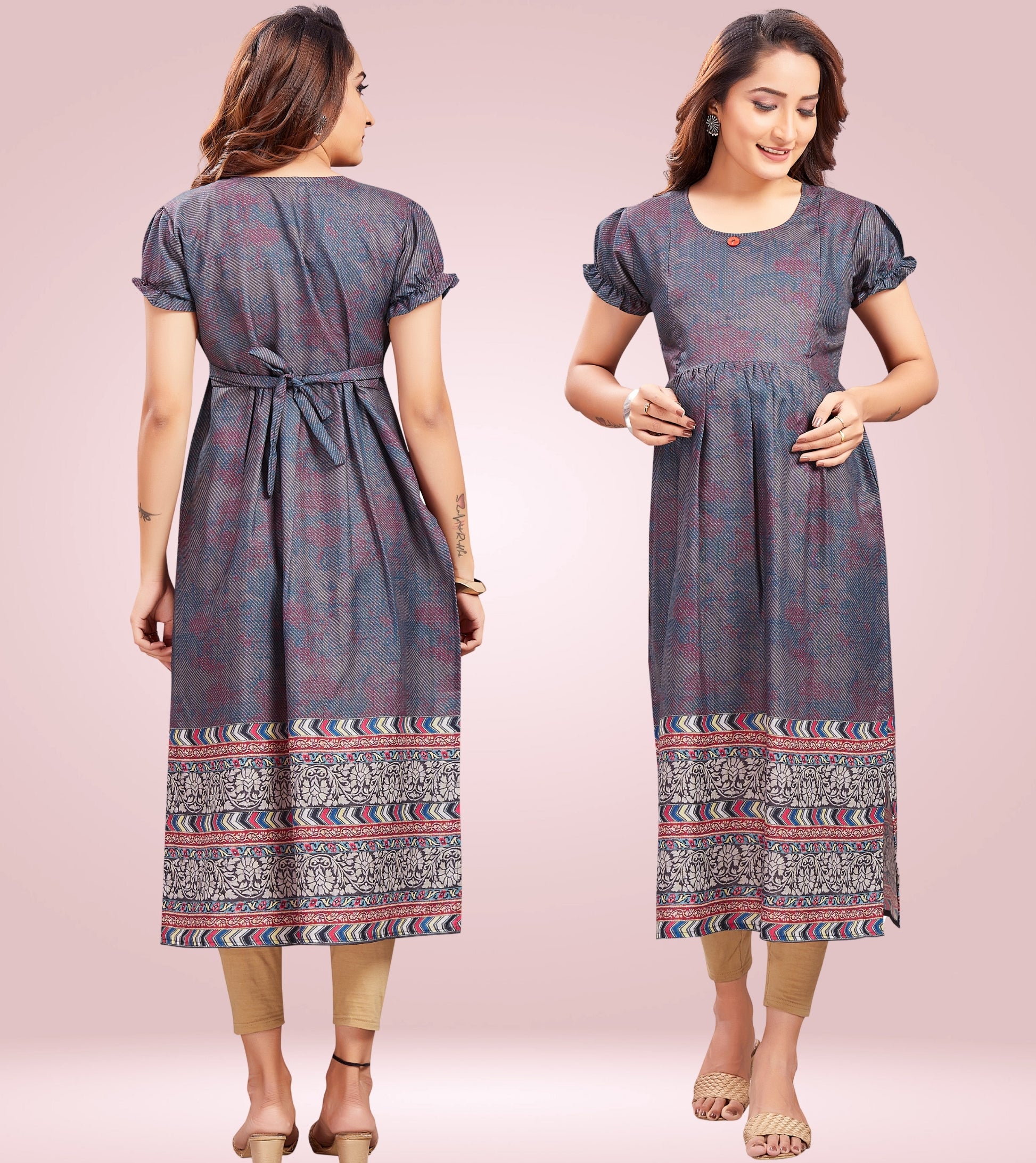 Stunning Blue Cotton Printed Flared Feeding Kurta