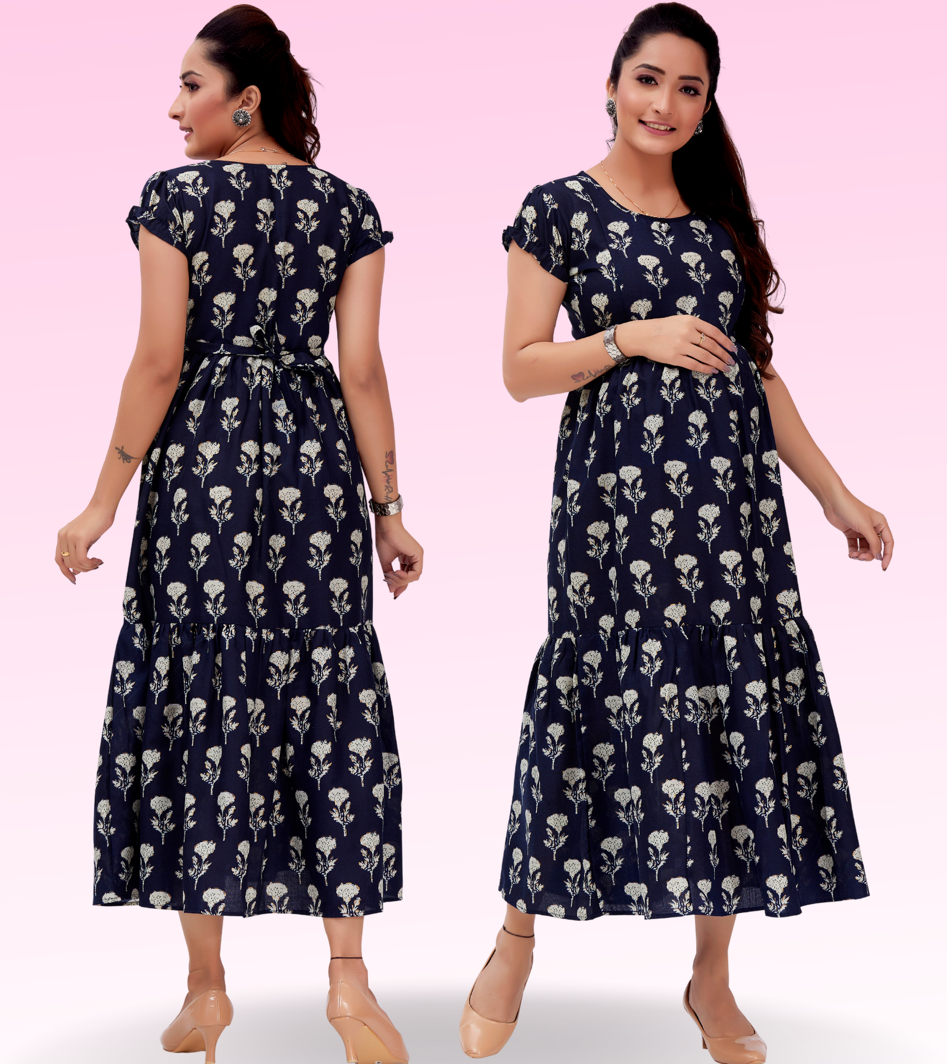Stunning Blue Cotton Printed Flared Feeding Kurta