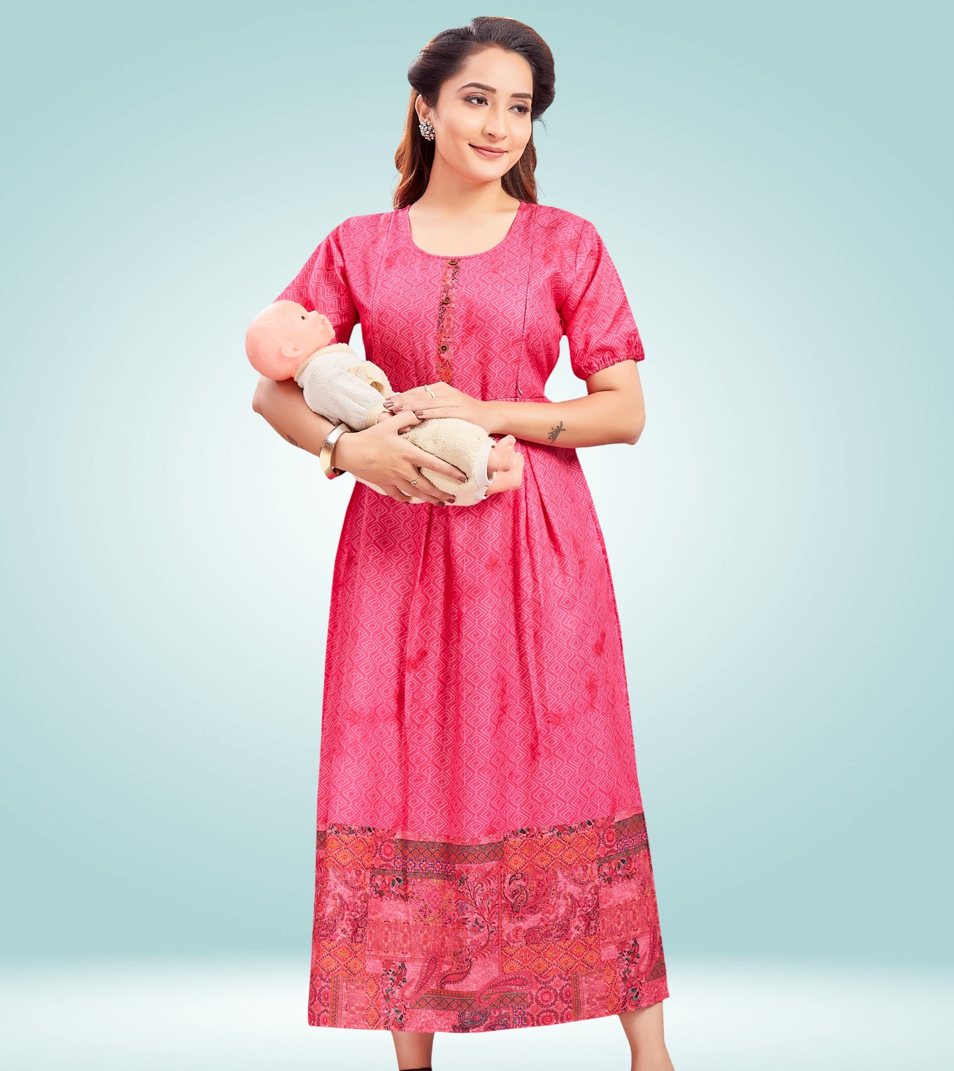 Stunning Pink Cotton Printed Flared Feeding Kurta