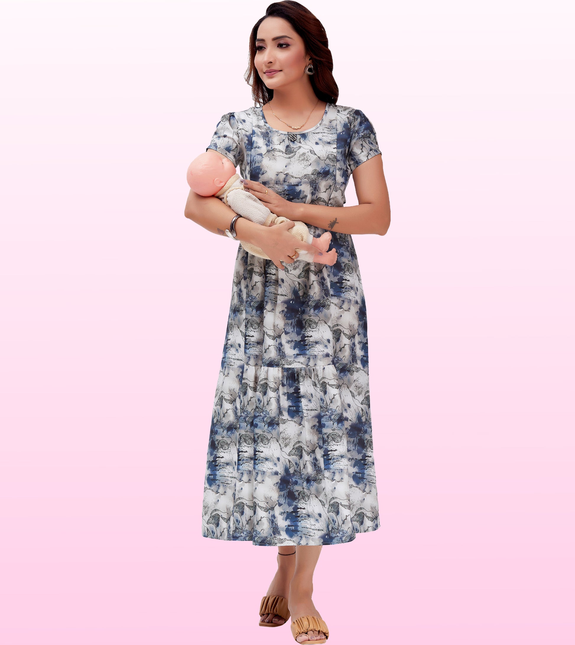 Stunning Blue Cotton Printed Flared Feeding Kurta