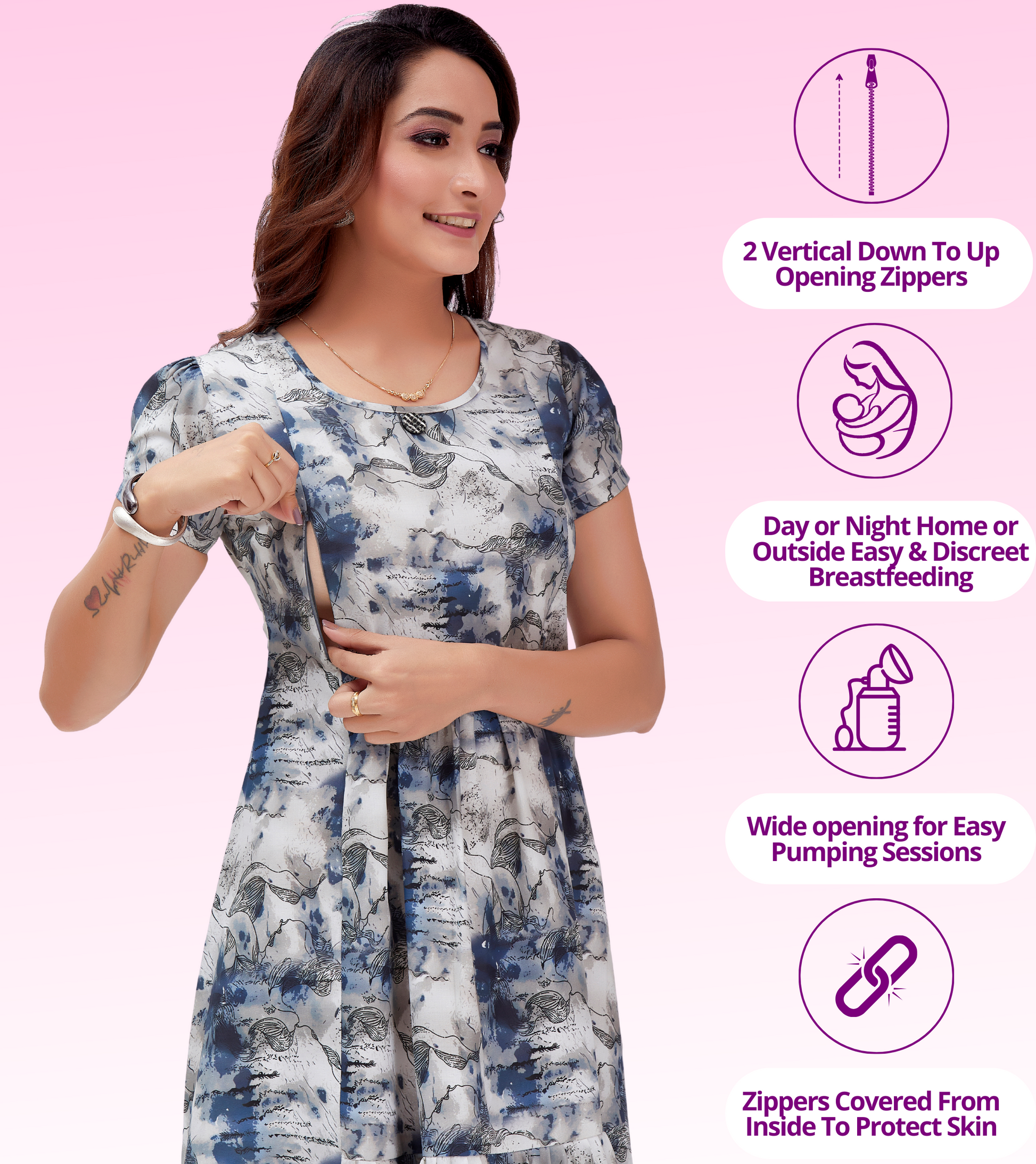 Dreamy Blue Cotton Printed Flared Zipless Feeding Kurta