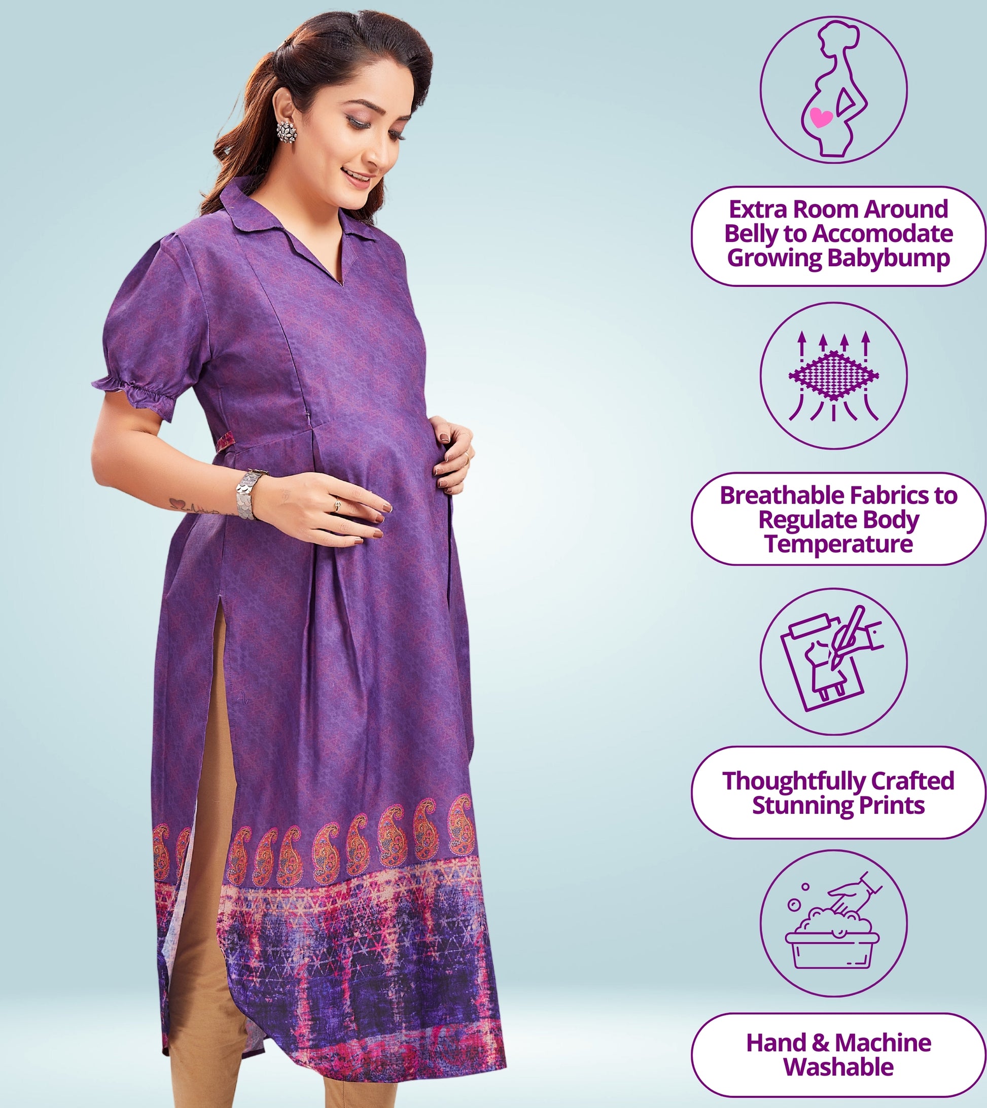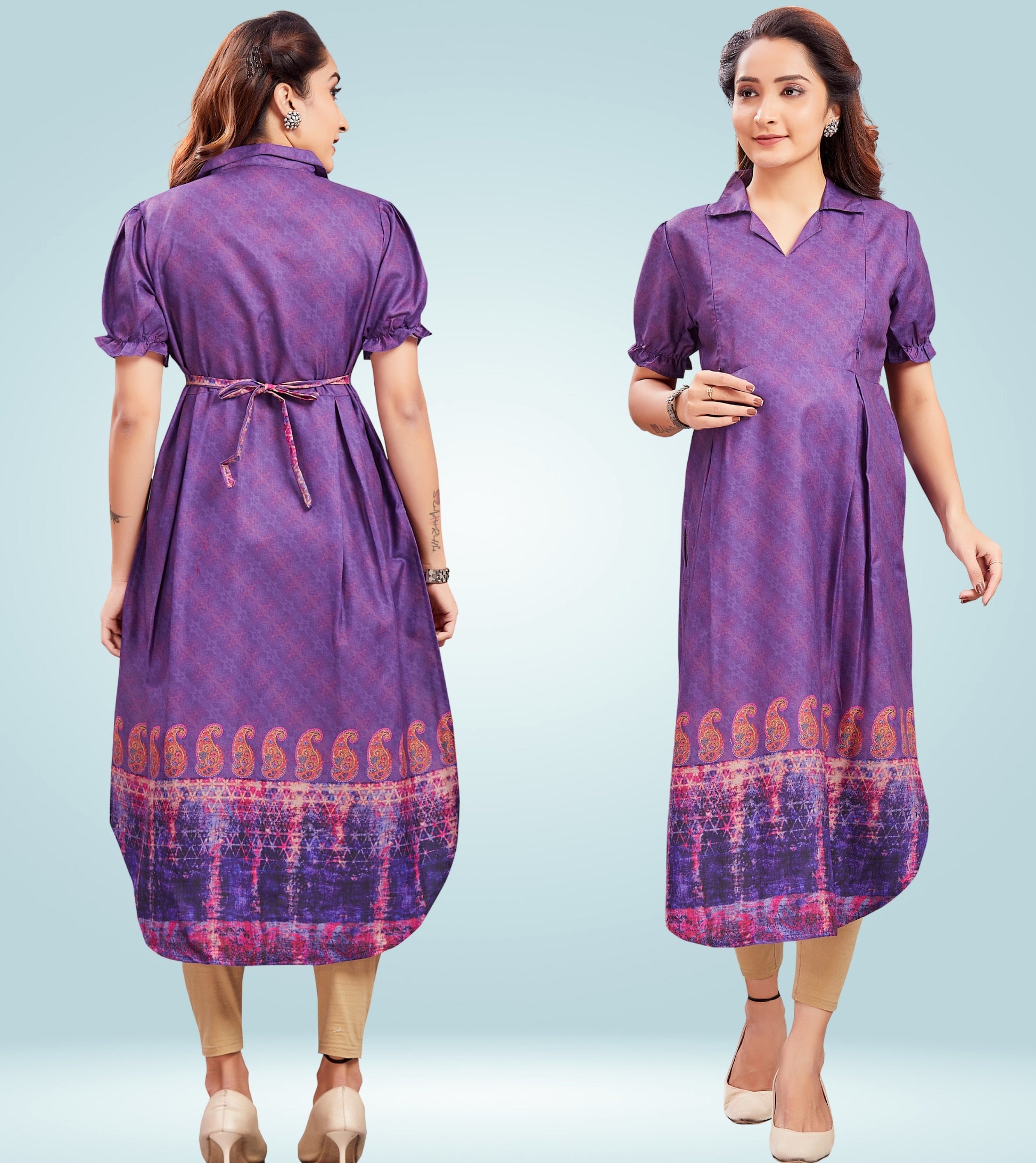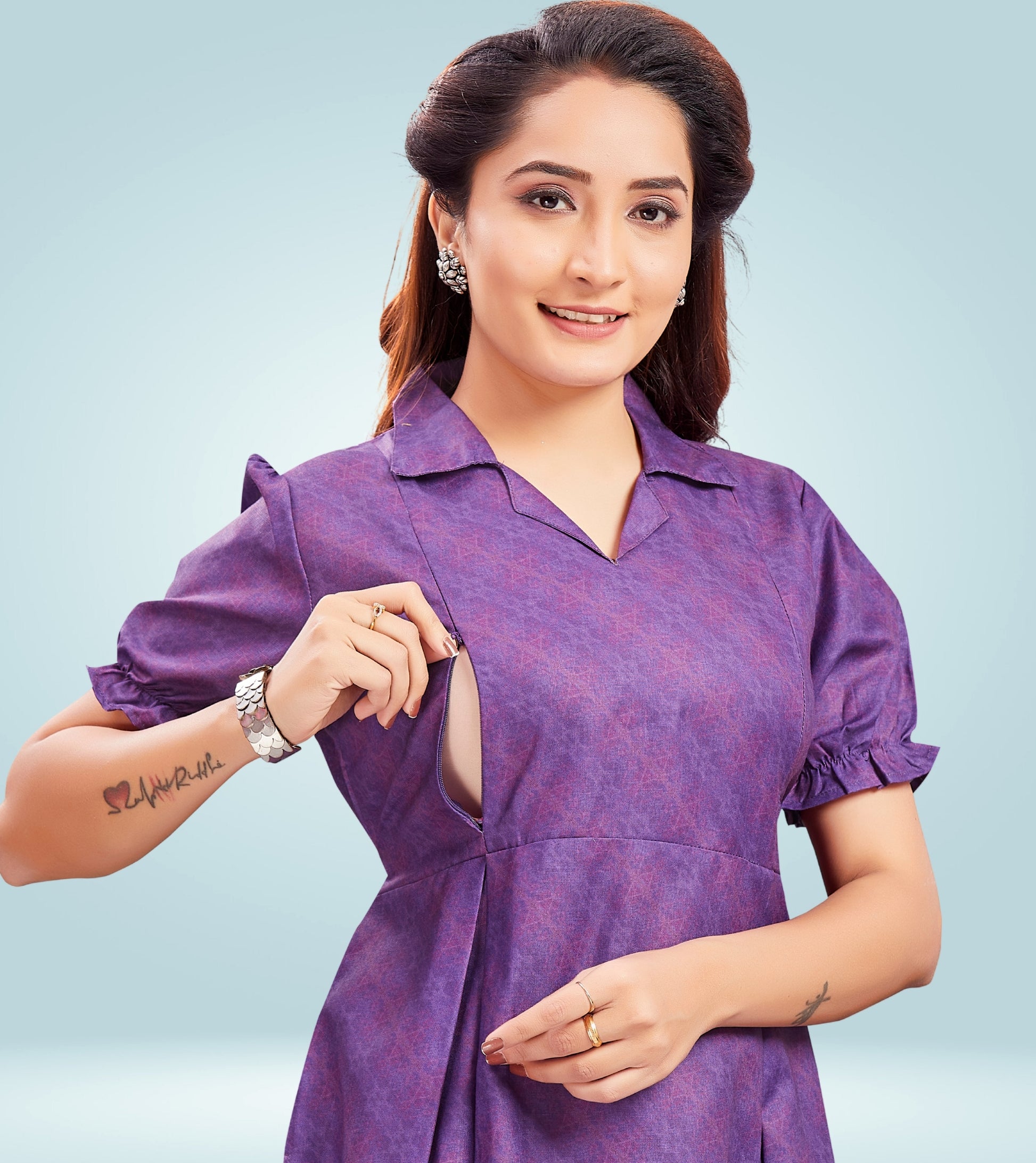 Classy Purple Cotton Printed Flared Zipless Feeding Kurta
