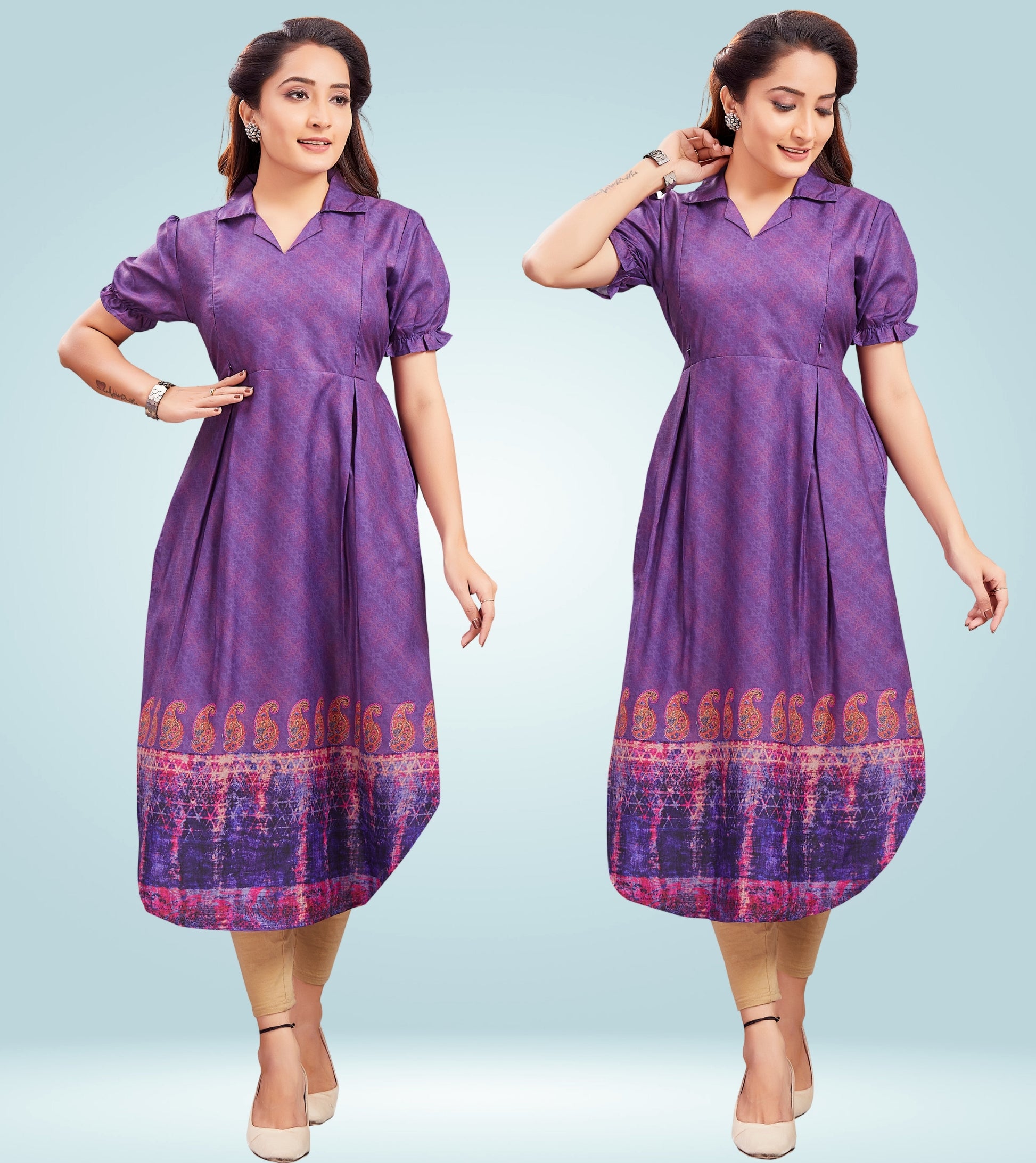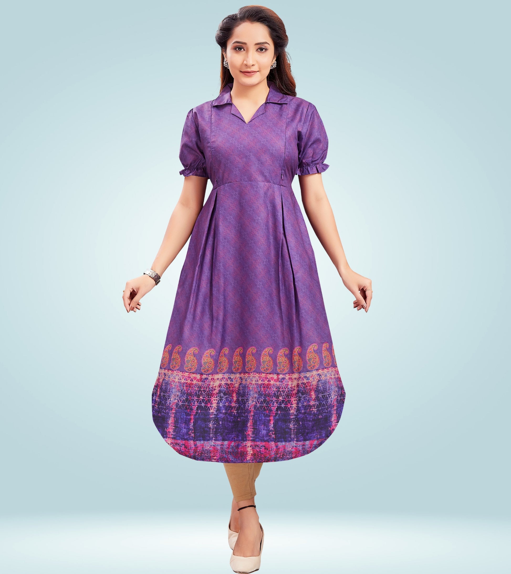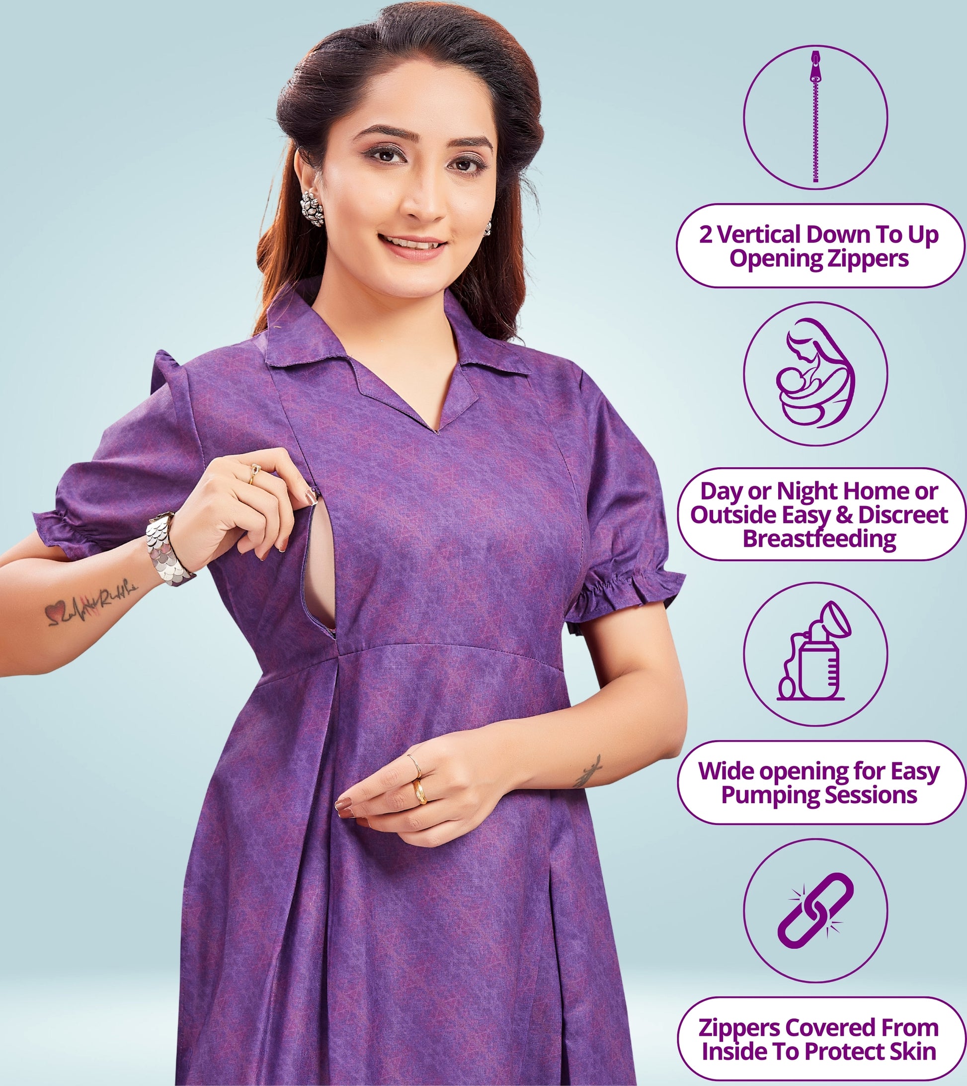 Classy Purple Cotton Printed Flared Zipless Feeding Kurta